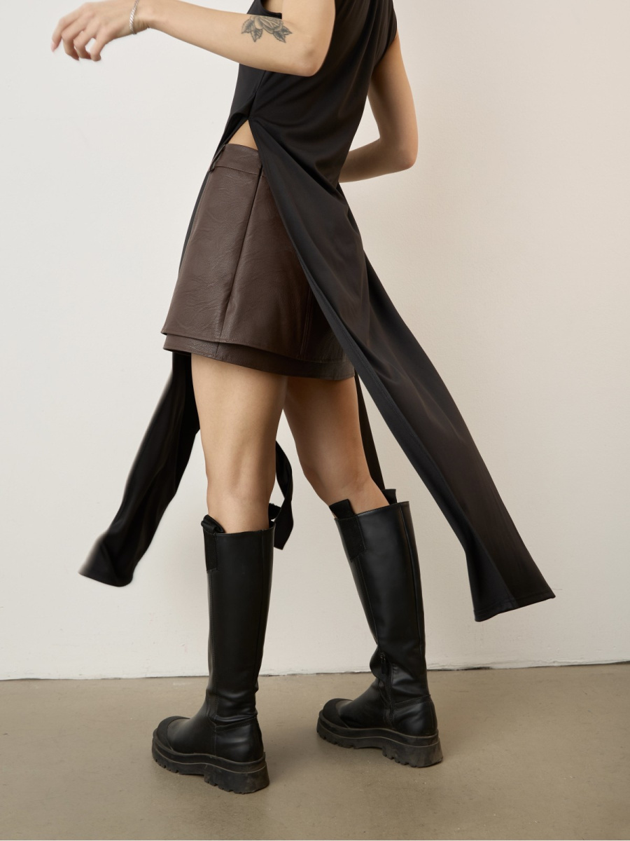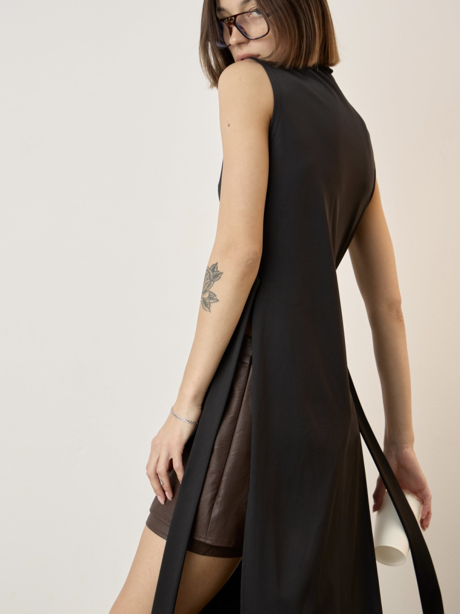 Удлиненный топ BLAZE в черном цвете — это многофункциональная модель верха, которая позволяет обыграть образ любой стилистики. Акцентные детали топы: глубокие разрезы по бокам и шлейки от линии талии, которые можно оставить в опущенном виде или обкрутить вокруг талии. Топ станет дополнением для брюк, джинсов и юбок различной длины. Изделие выполнено из плотного тянущегося материала с небольшим сатиновым покрытием.