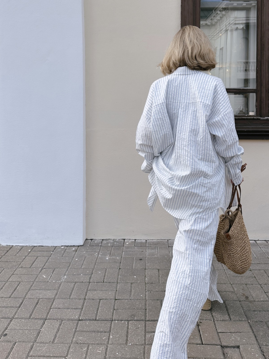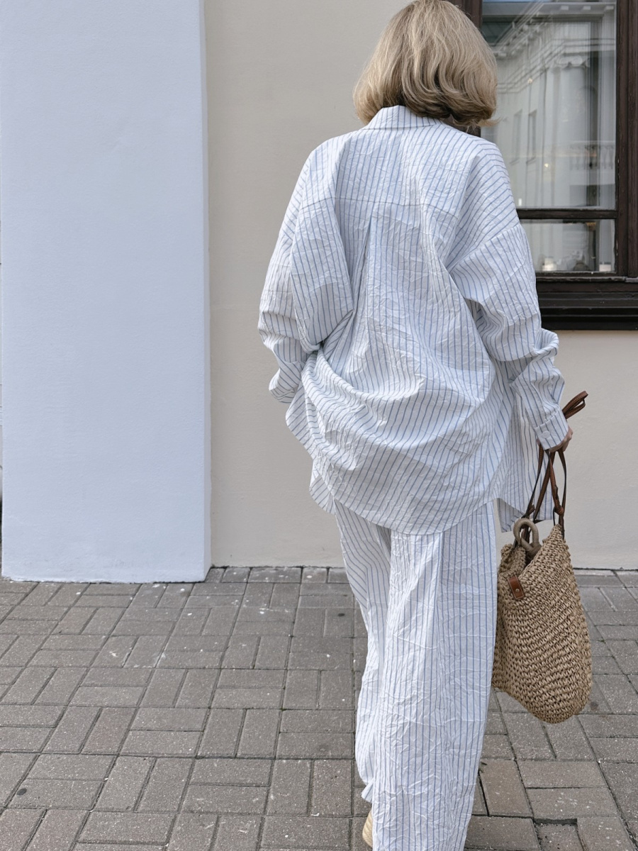 Лёгкий костюм из жатого хлопка: свободная рубашка на пуговицах и брюки с комфортной посадкой на резинке.