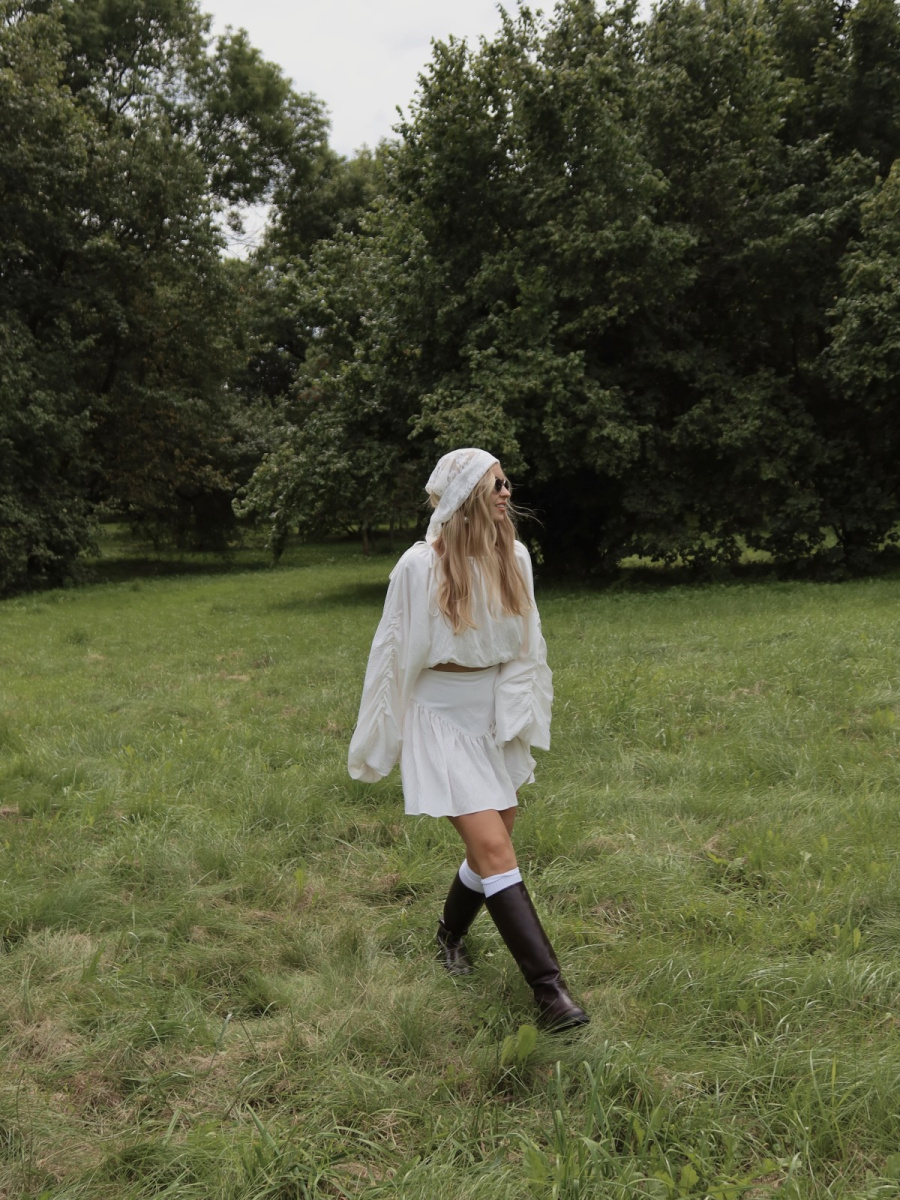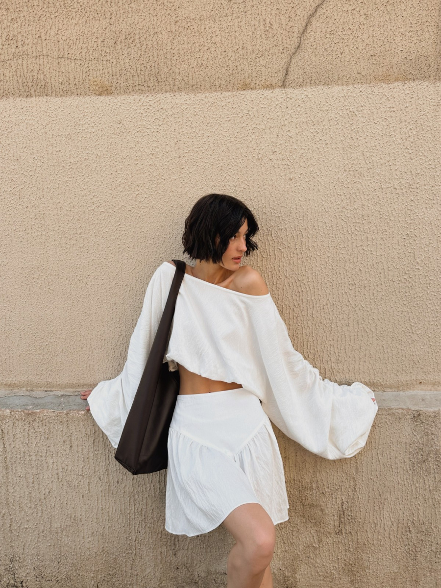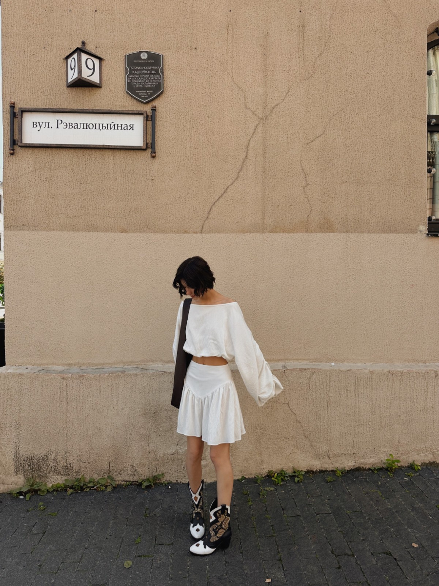 Костюм состоит из юбки на замке в стиле бохо и топа на резинке с завязками, позволяющие регулировать линию плеч.