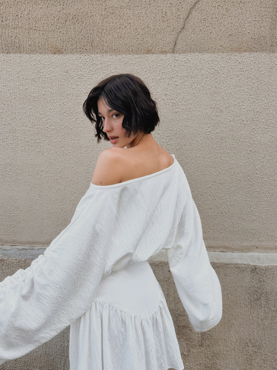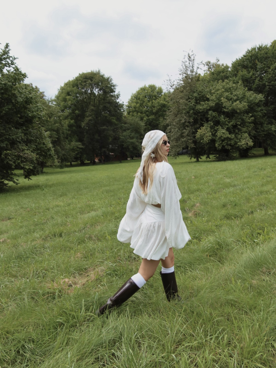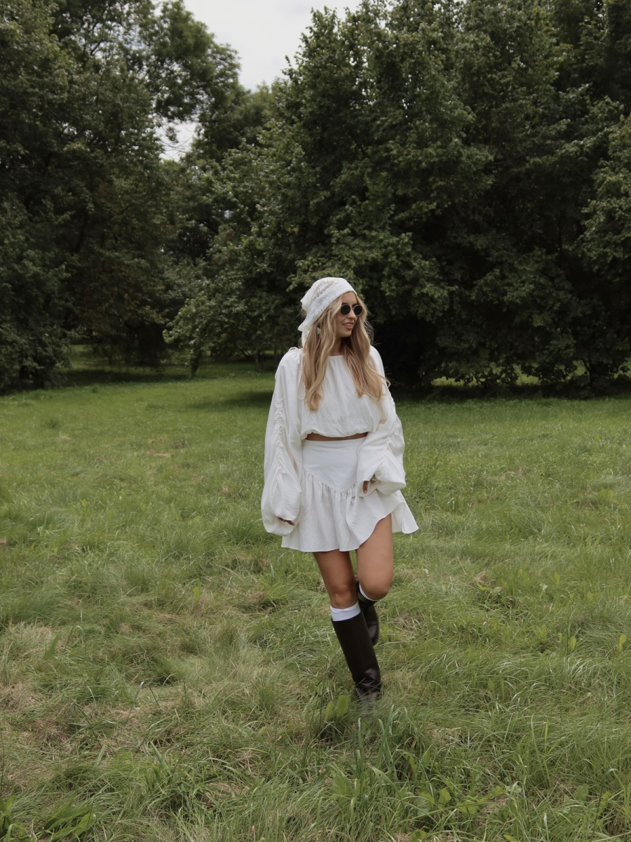 Костюм состоит из юбки на замке в стиле бохо и топа на резинке с завязками, позволяющие регулировать линию плеч.