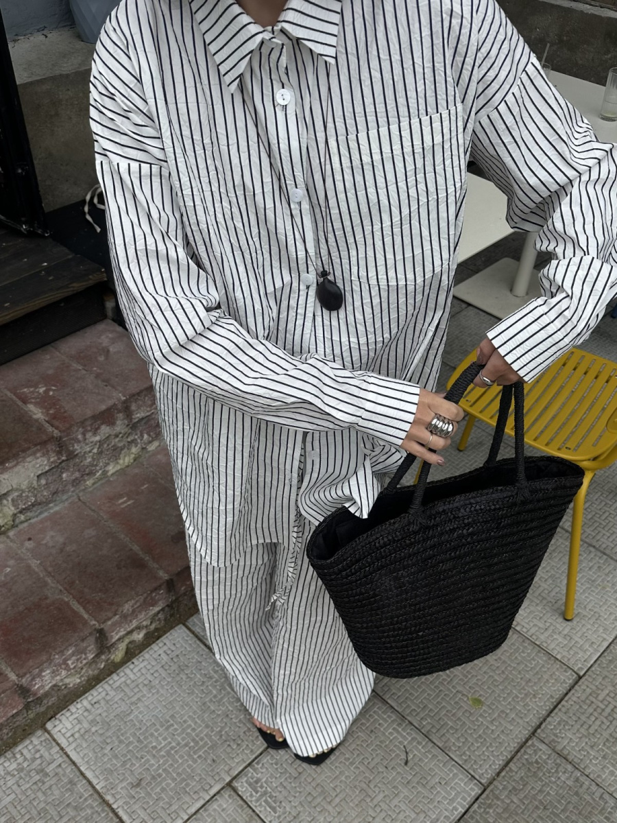 Лёгкий костюм из жатого хлопка: свободная рубашка на пуговицах и брюки с комфортной посадкой на резинке.