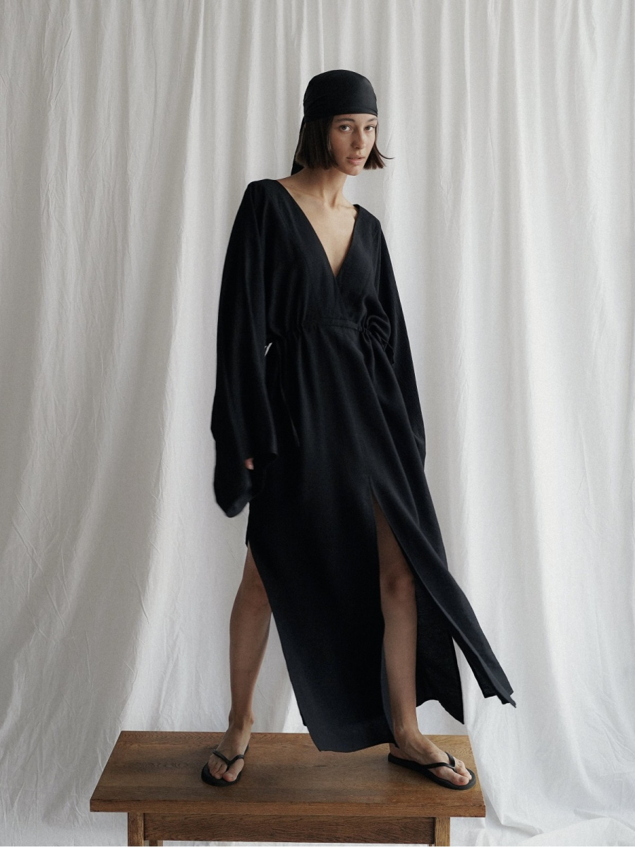 Платье выполнено в длине макси и регулируется на талии с помощью завязок по бокам. Три разреза — по центру спереди и по бокам с двух сторон. Платье дополнено рукавами-кимоно и V-образными вырезами спереди и сзади (на спинке для фиксации платье дополнено перемычкой).