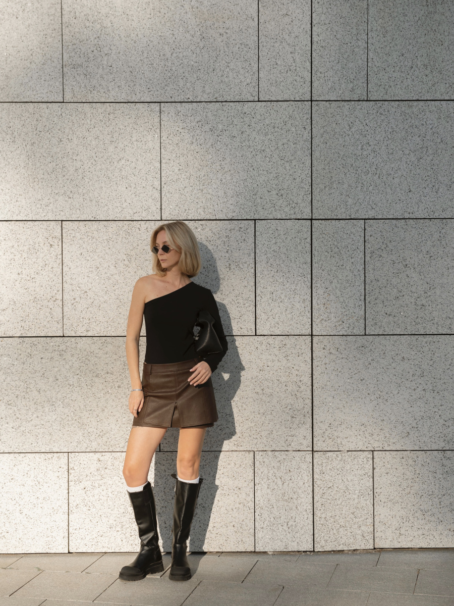 Универсальная средняя посадка позволяет носить юбку на бедрах и на талии, шлевки позволяют добавить ремень.