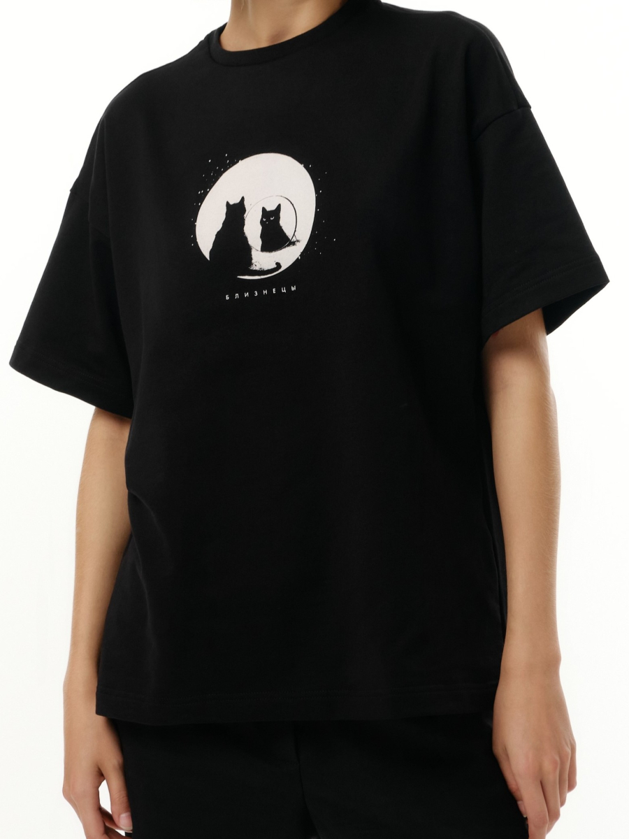 Уникальный принт с котами, разработанный иллюстратором, очень точно отражает характер каждого знака зодиака. Футболка плотная имеет оверсайз крой и подойдет на любой тип фигуры.