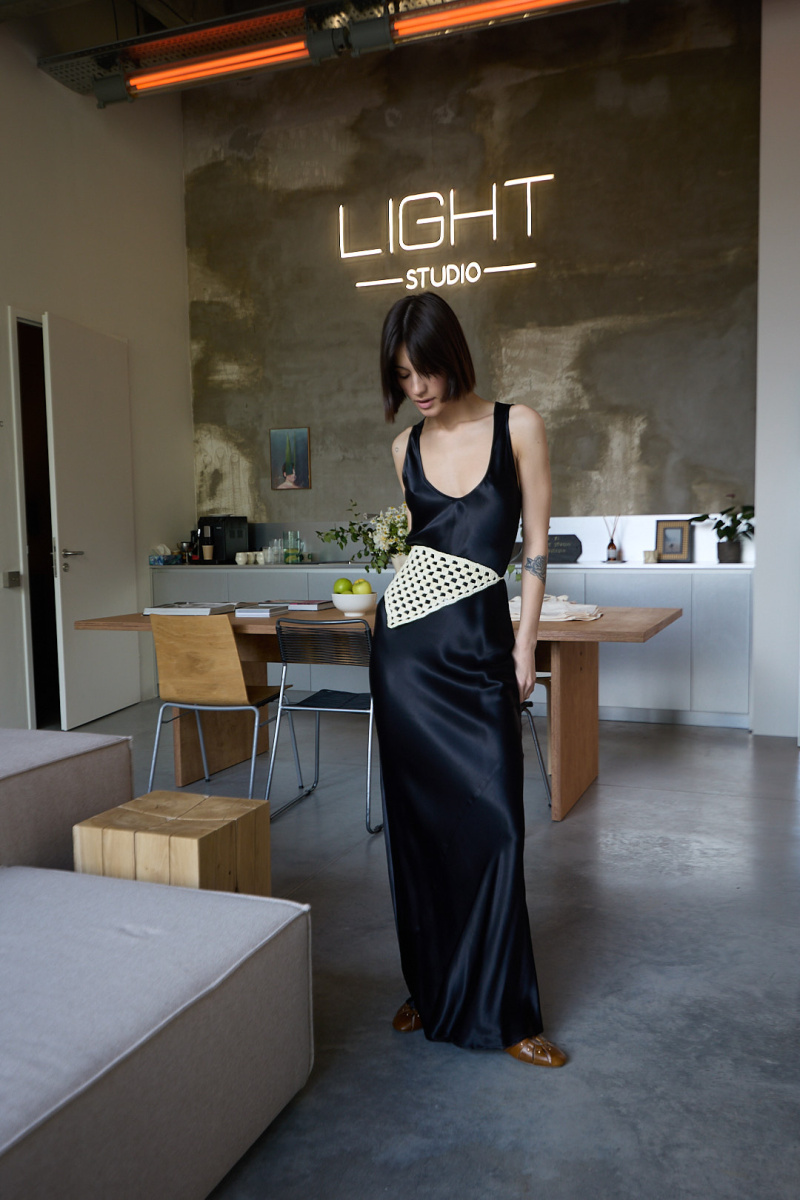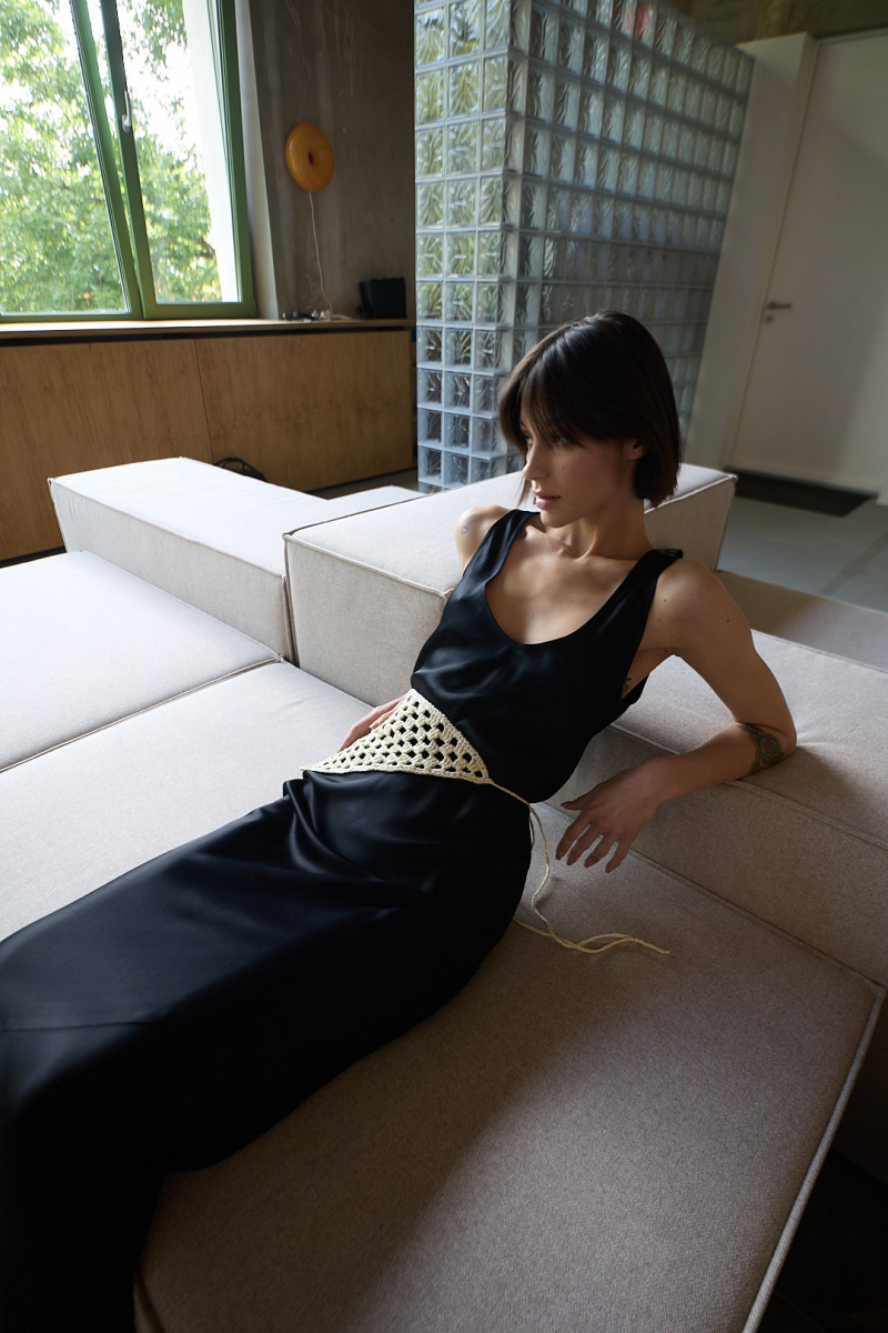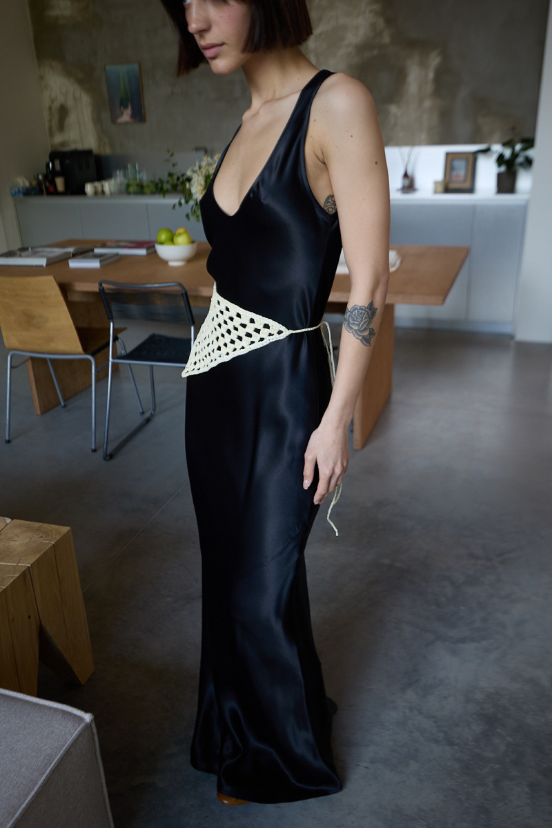 Платье из шелковистой вискозы, выкроено накосую, длина в пол, верх платья на широких бретелях