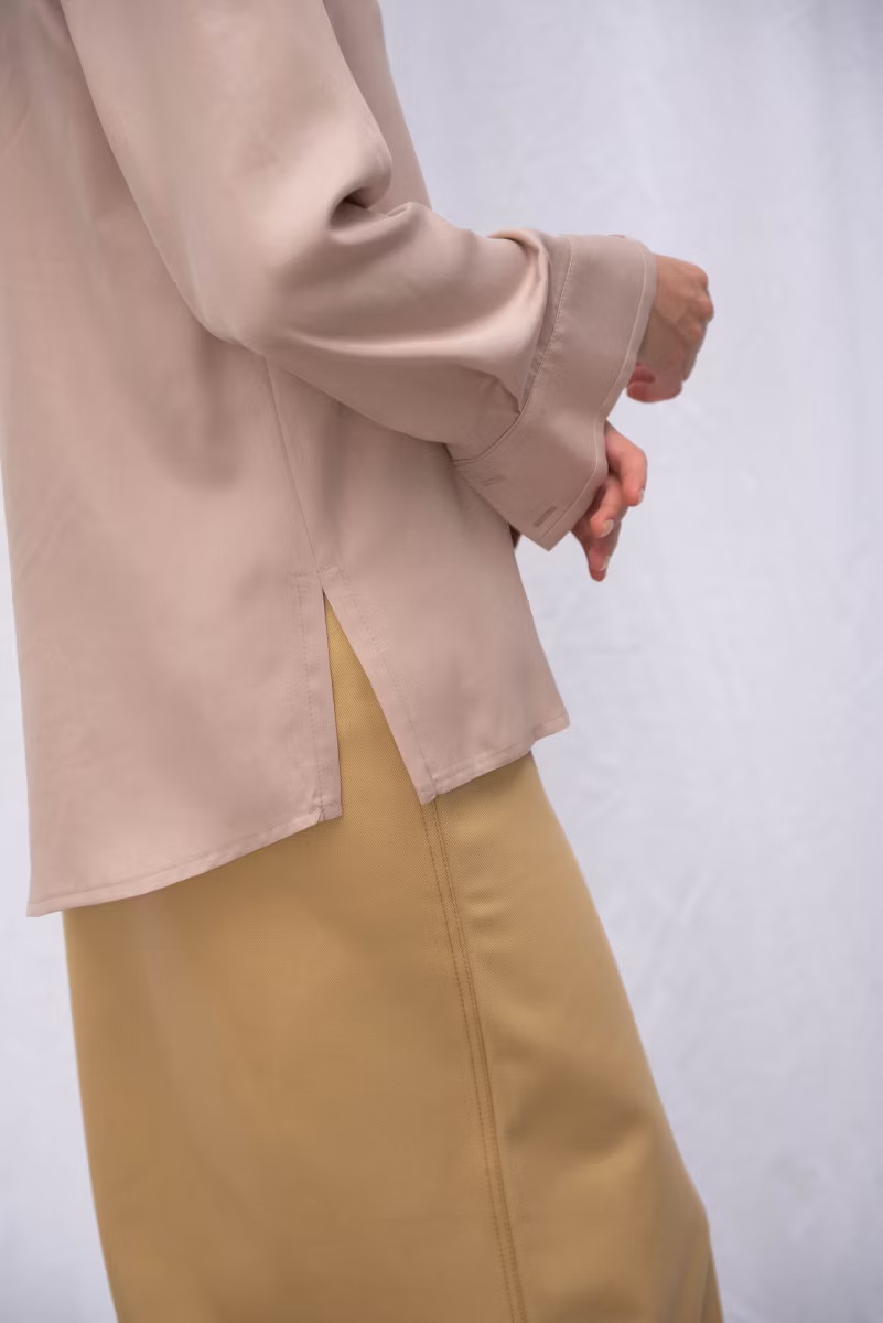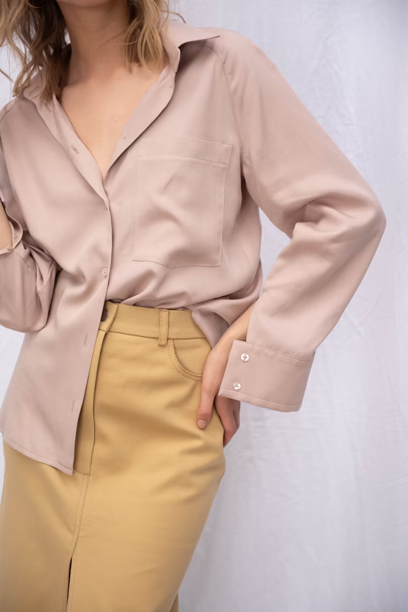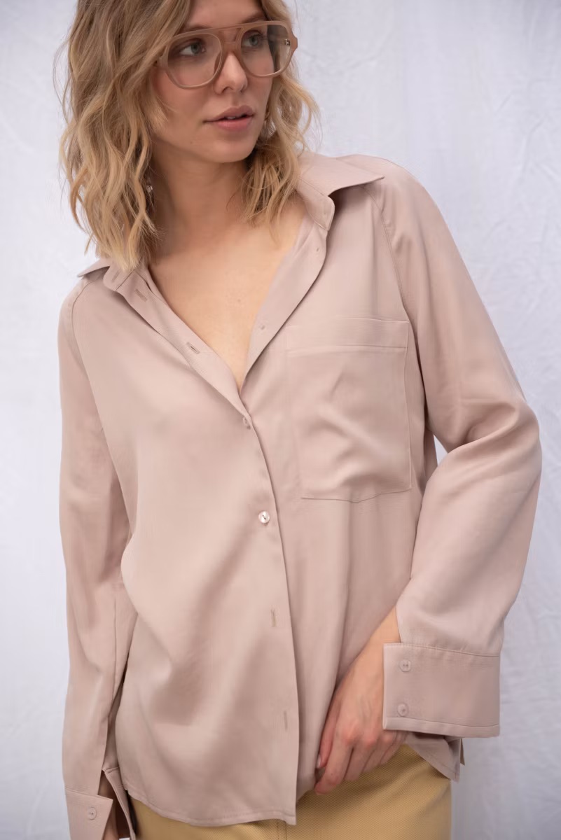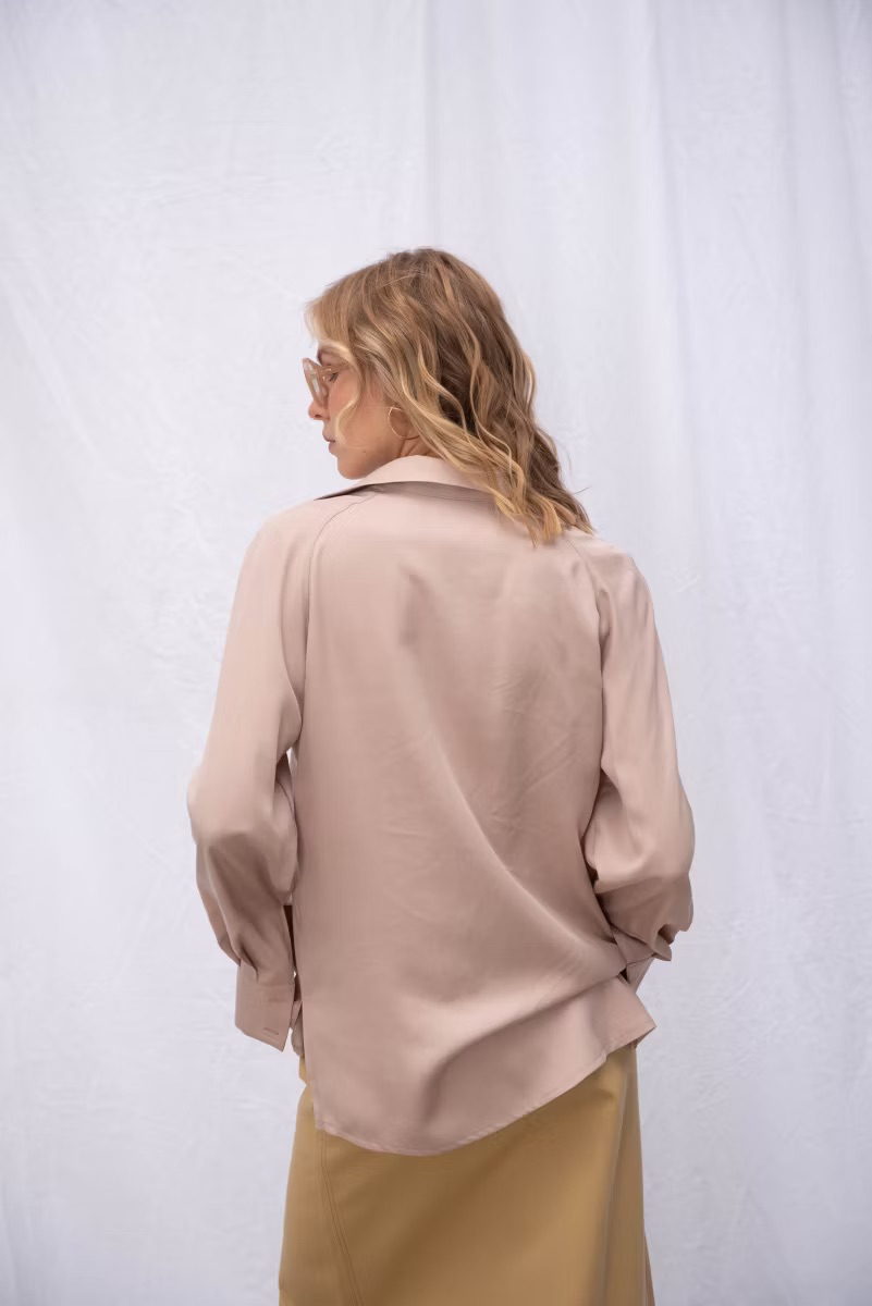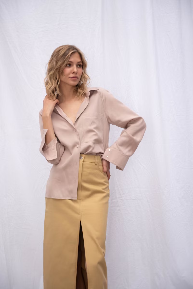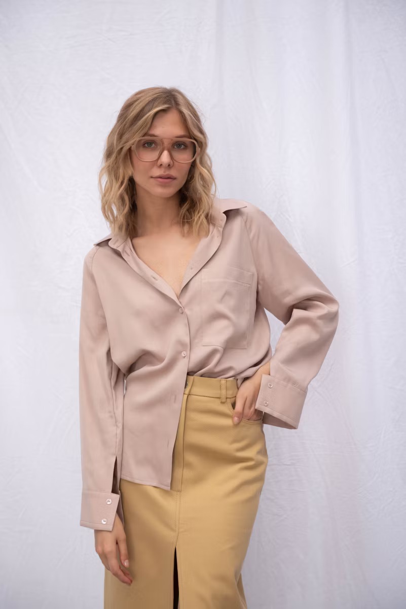 Рубашка свободного прямого кроя, рукава покроя реглан, широкая манжета, отложной воротник с отрезной стойкой, застежка на петли и пуговицы, по бокам предусмотрены разрезы.