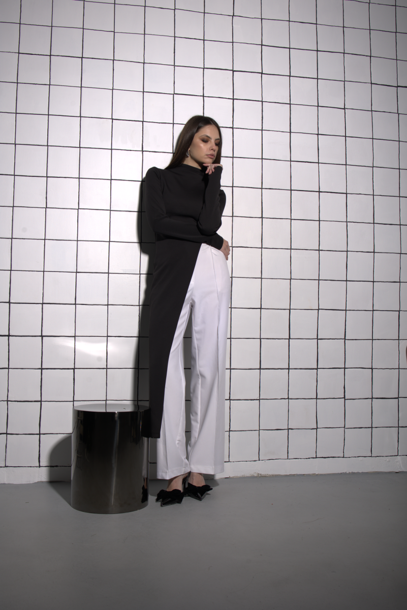 Теплый и стильный лонгслив ассиметричный с одной удлиненной стороной. Выполнен из поливискозного трикотажного полотна. С цельнокроеным горлом и длинным рукавом.