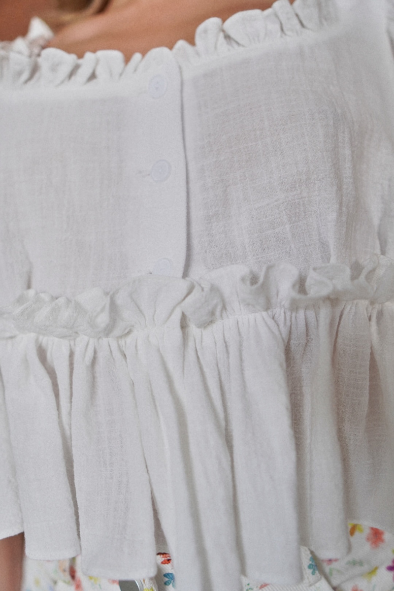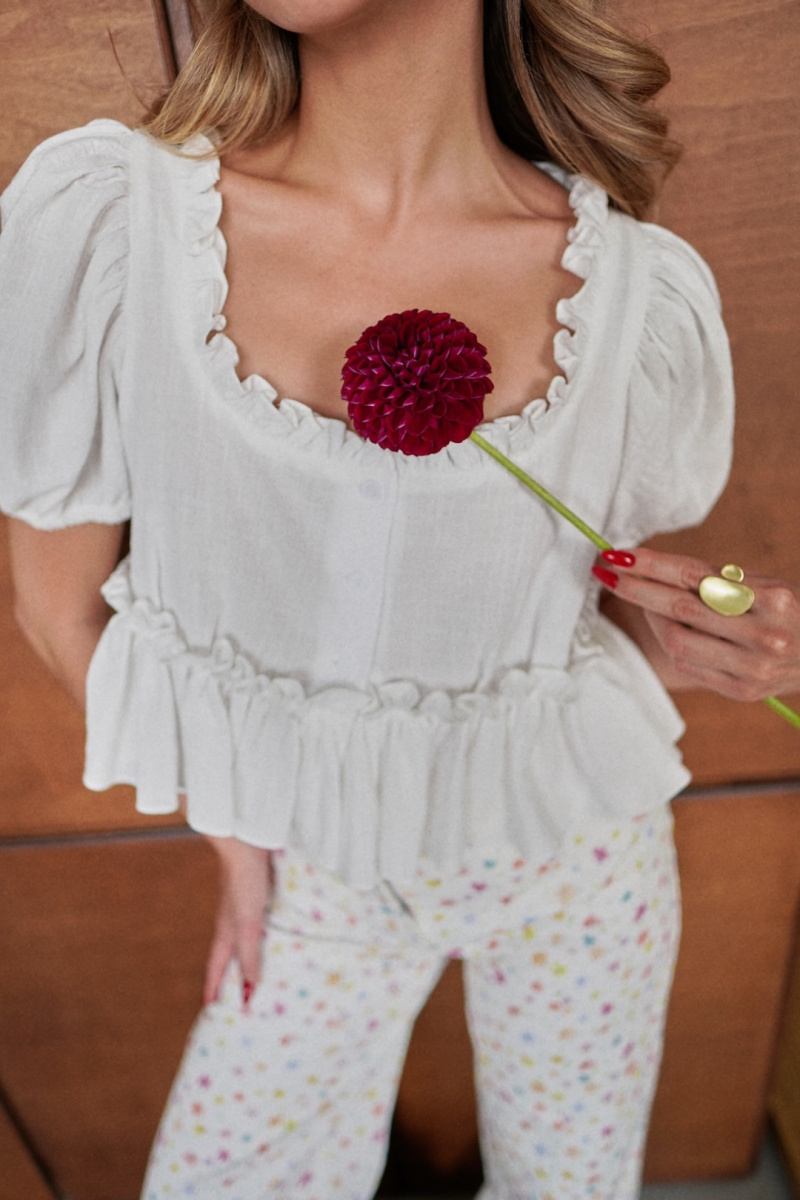 Погрузитесь в нежность с укороченной блузой с коротким рукавом и рюшами, выполненной из 100% жатого хлопка. Эта блуза представлена в трех великолепных цветах: банановом, молочном и розовом. Легкая и воздушная, она идеально дополнит любой летний образ.
