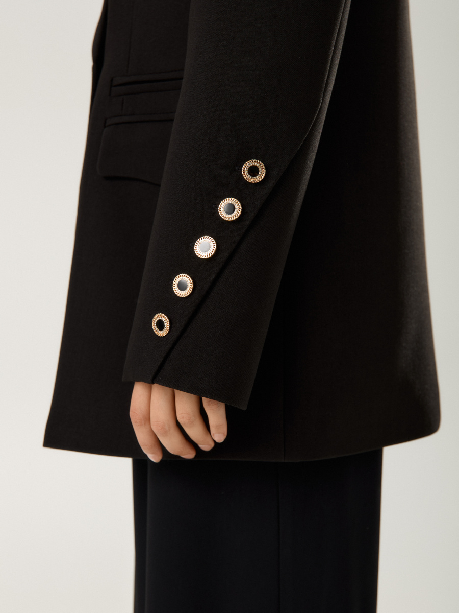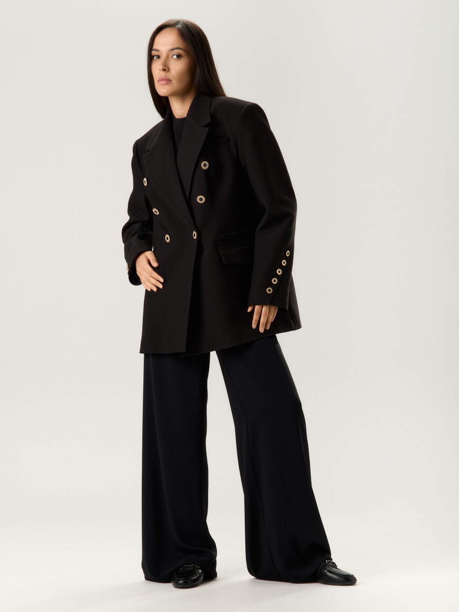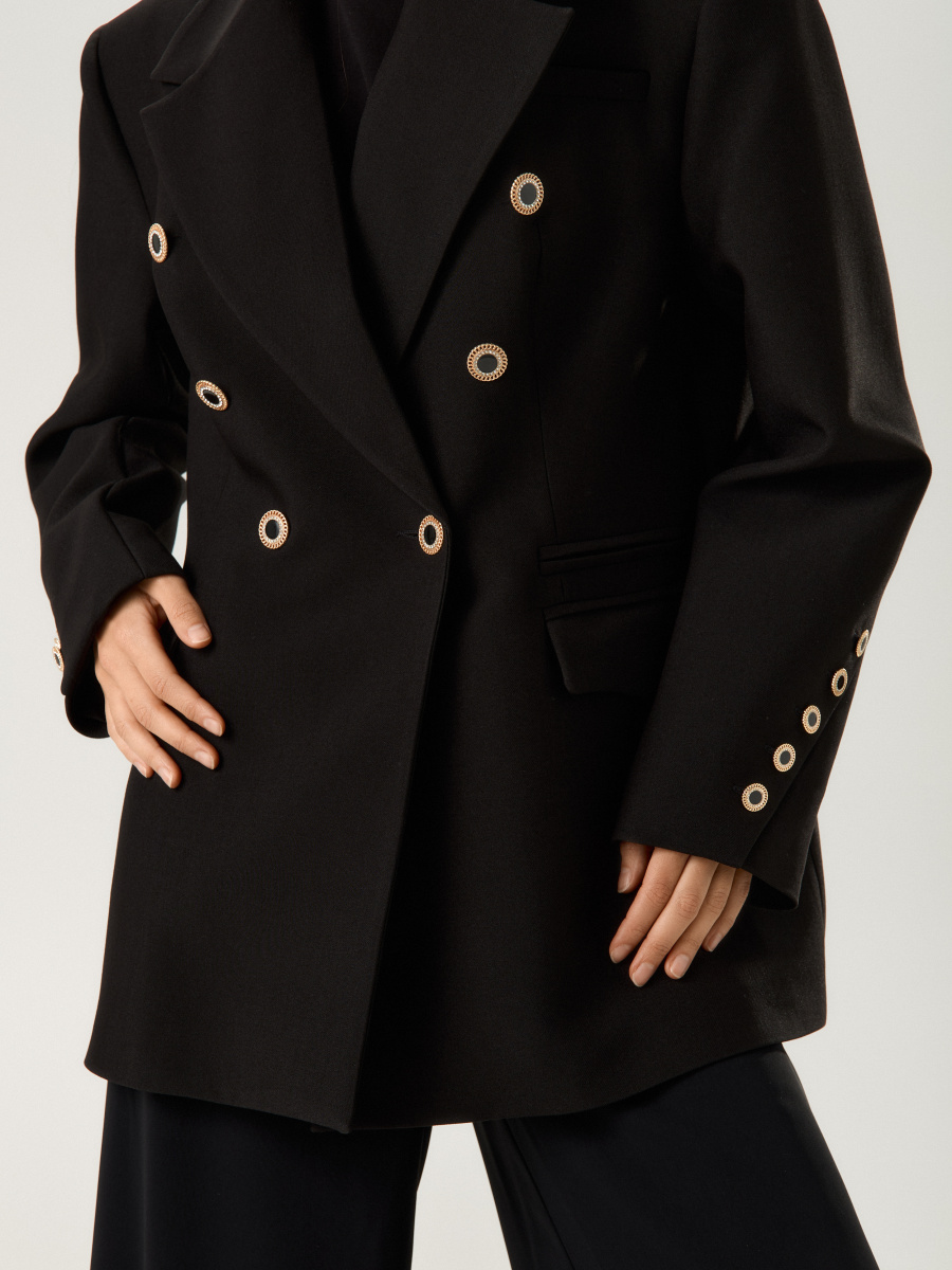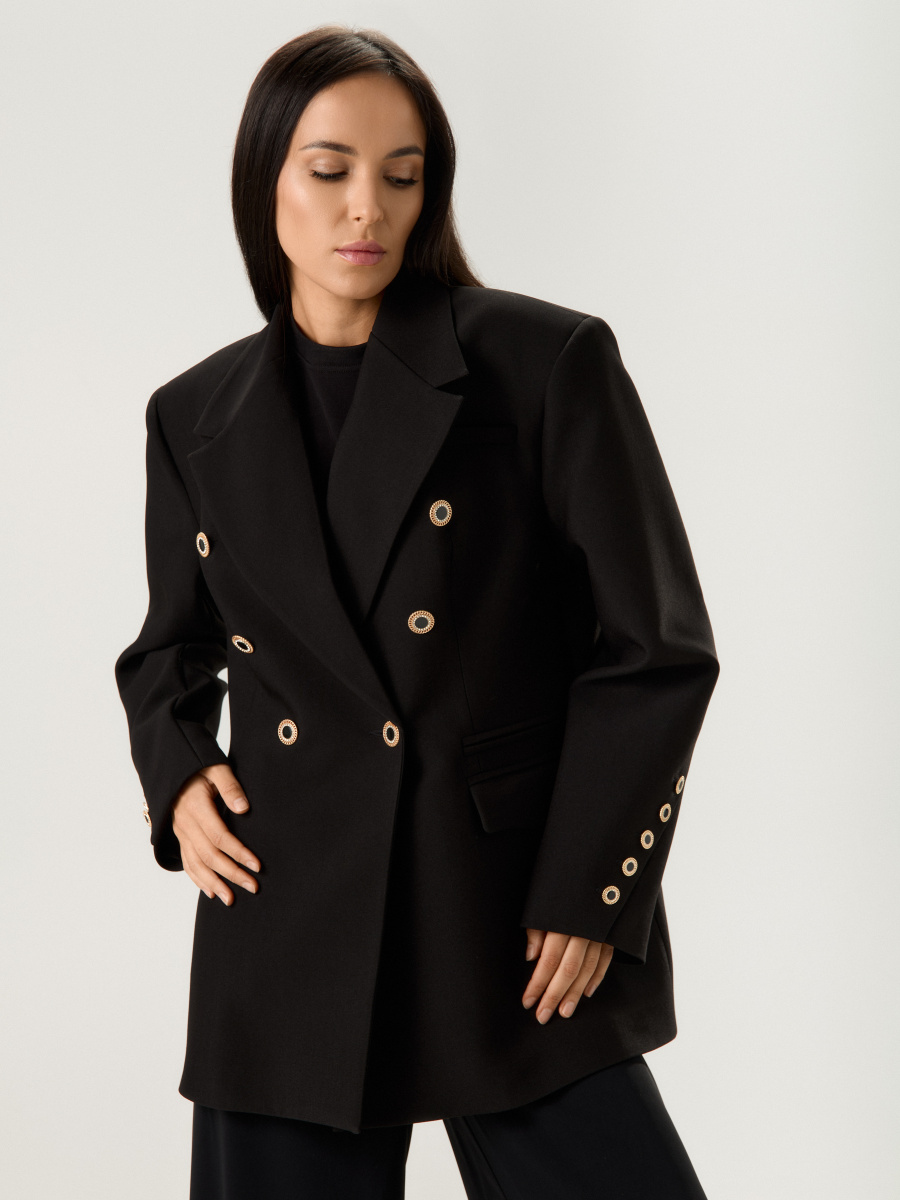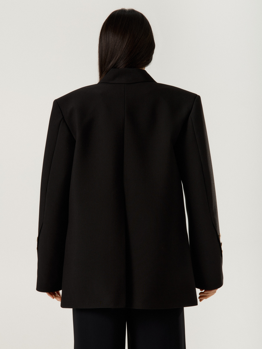 Жакет двухбортный, спущенная линия плеча. Рукав втачной, двухшовный, по низу фигурная декоративная шлица с пуговицам. По переду слева выше линии груди декоративная листочка, от линии талии декоративный карман в рамку и функциональный карман с фигурным клапаном. По переду справа от линии талии функциональный карман с фигурным клапаном. По центральному шву спинки высокая шлица, по переду жакета идут декоративные пуговицы по диагонали. Жакет на подкладке.