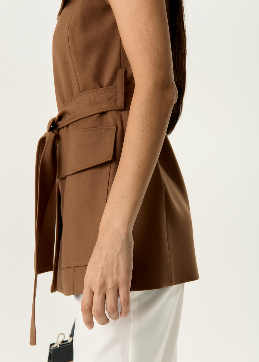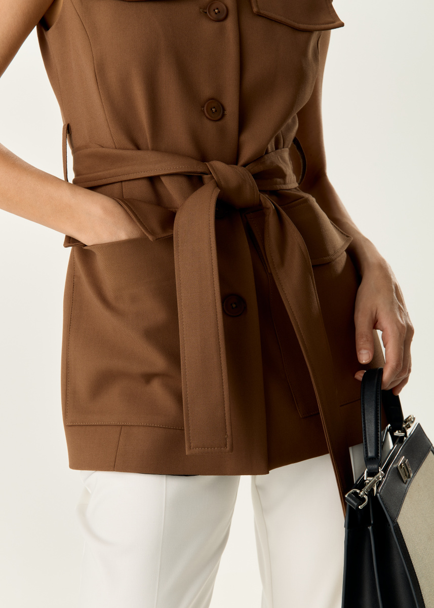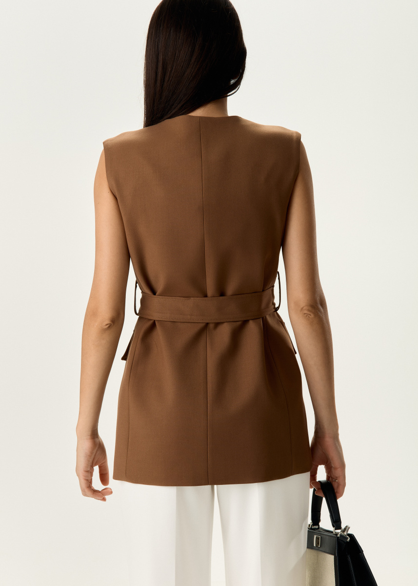 Жилетка женская полуприлегающего силуэта, удлинённая. На подкладке. Застежка на петли пуговицы спереди. По переду отрезная кокетка с декоративными клапанами, накладные карманы с клапанами от линии талии (функциональные). По переду вертикальные рельефы. Дополнительно сделать акцент на талии можно при помощи съёмного пояса.