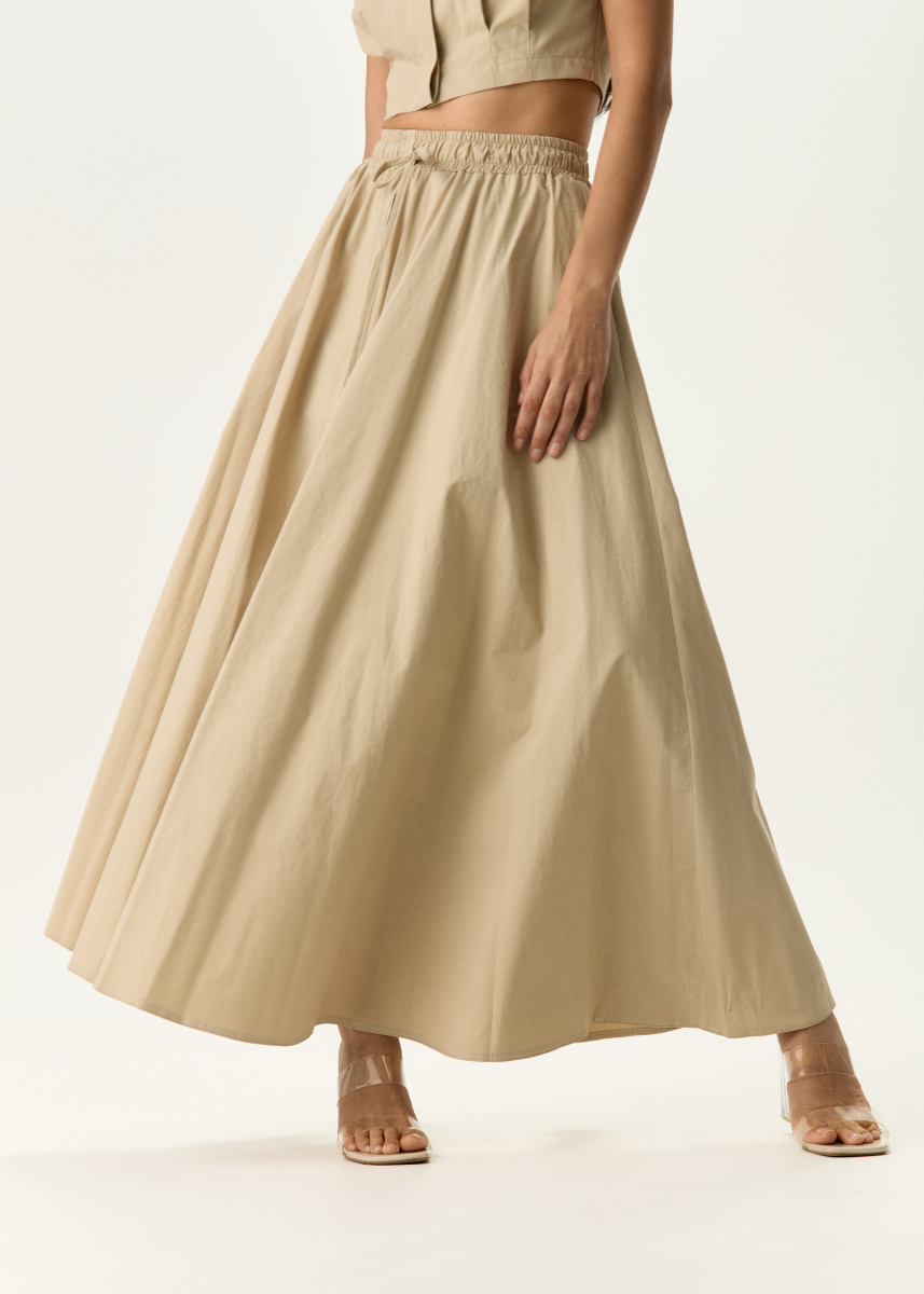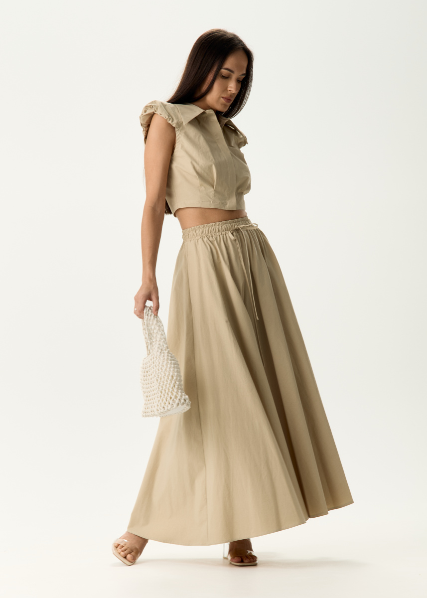 Юбка полусолнце, длинная. Притачной пояс на резинке + шнурок для дополнительной фиксации талии. В боковых швах карманы.