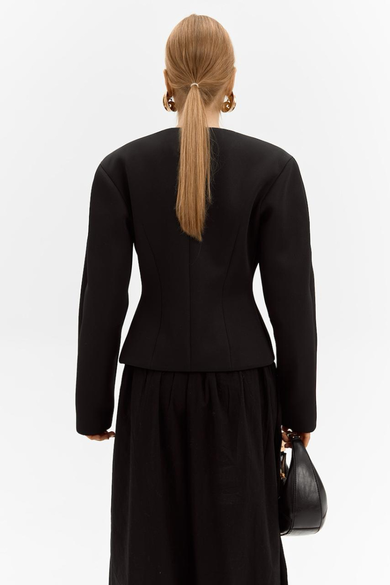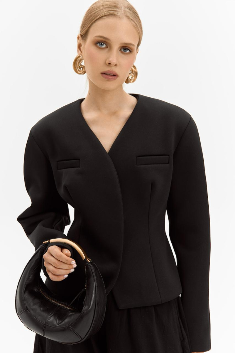 Жакет выполнен из плотной итальянской ткани. Отсутствие лацкана и V-образный вырез придают изделию элегантный вид.