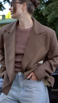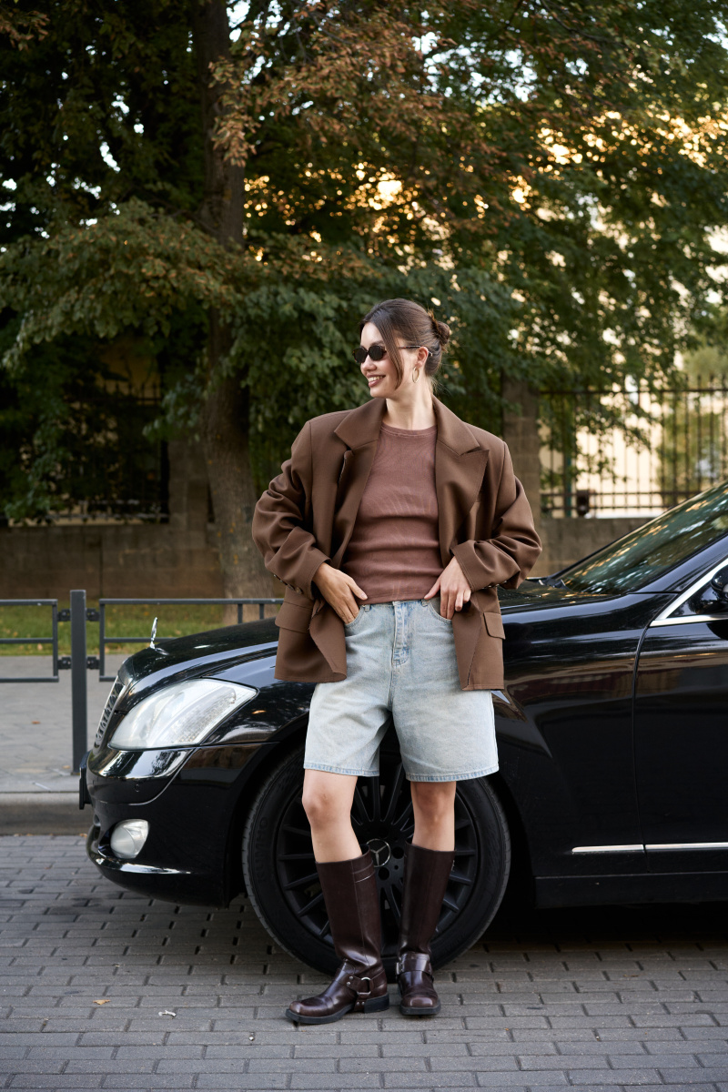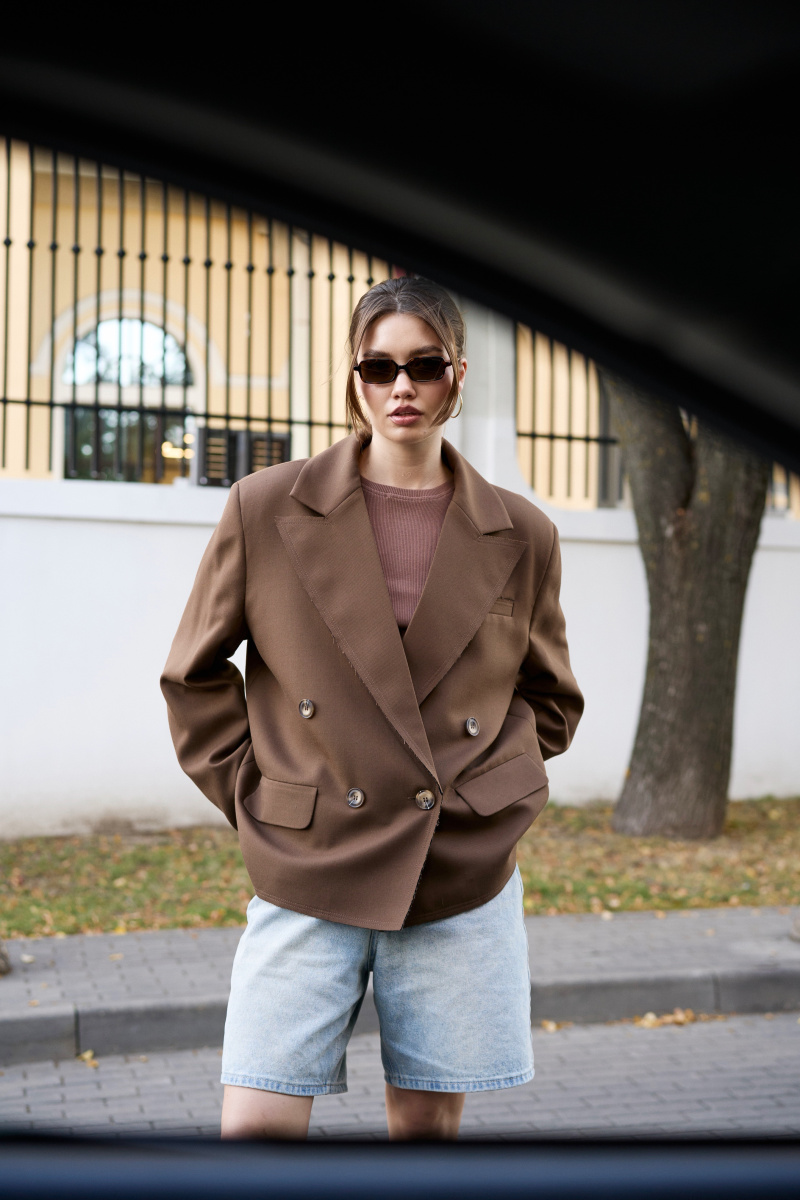 Классика, переосмысленная в духе современной эстетики. Глубокий и насыщенный шоколадный цвет добавляет образу статусности и тепла, а эффектные необработанные края придают строгому двубортному силуэту дерзкую небрежность и авторский характер.