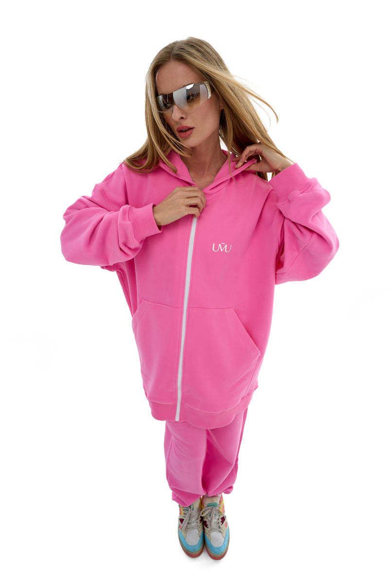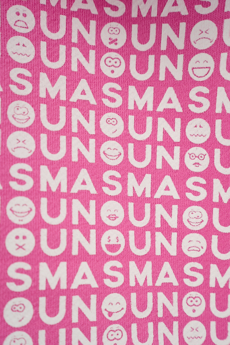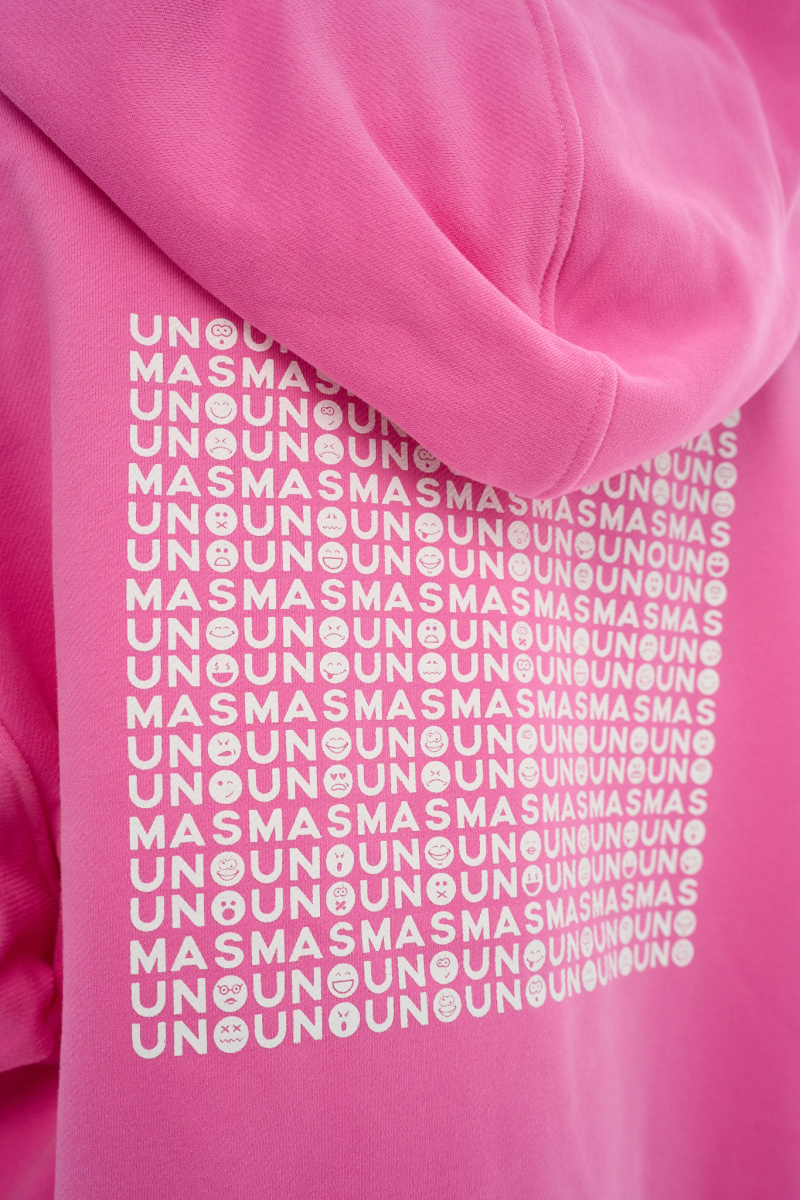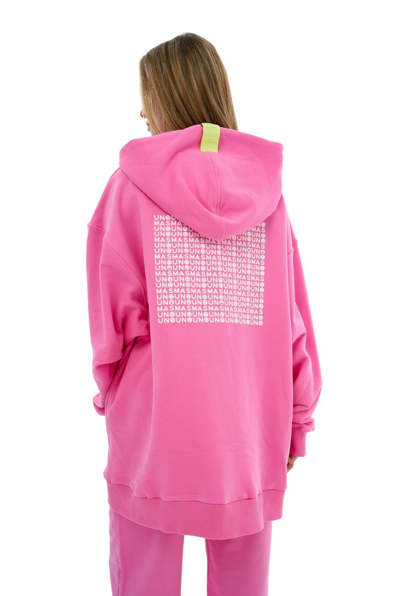 Толстовка в взрывном розовом оттенке с белой фурнитурой и принтом на спине с надписями UNO MAS UNO и смайлами.