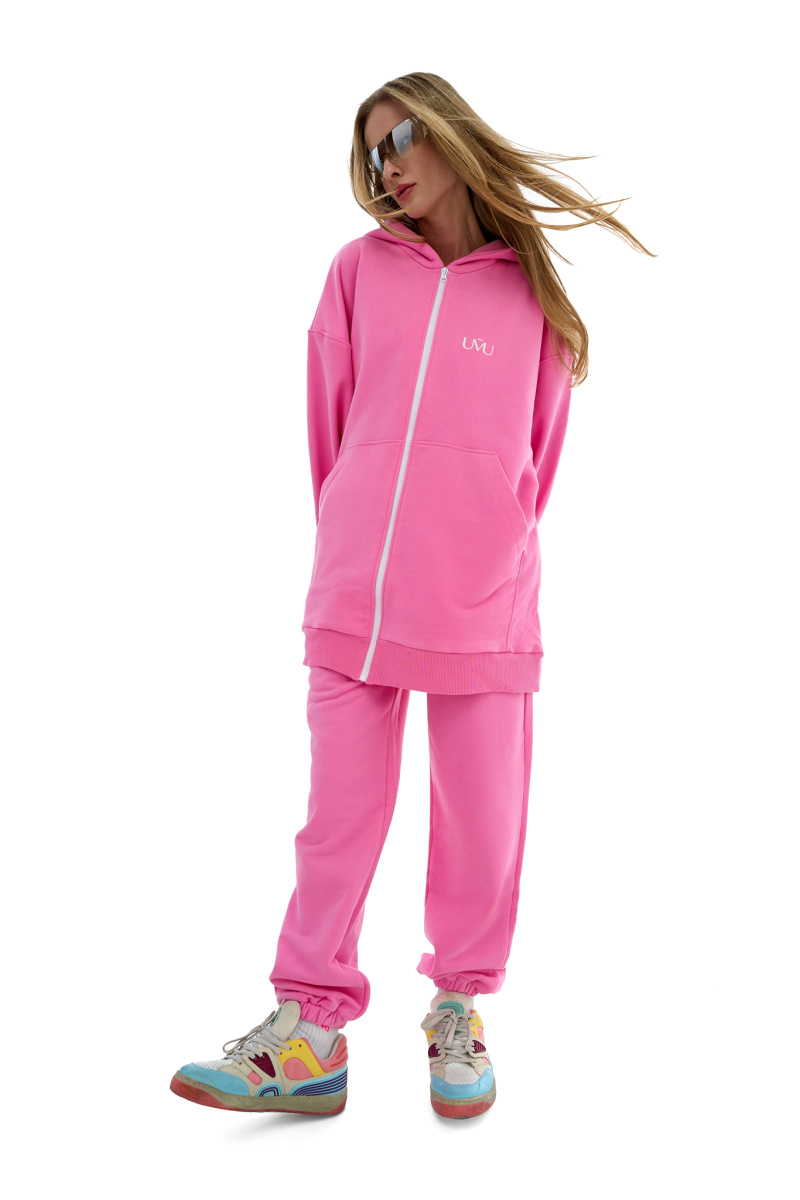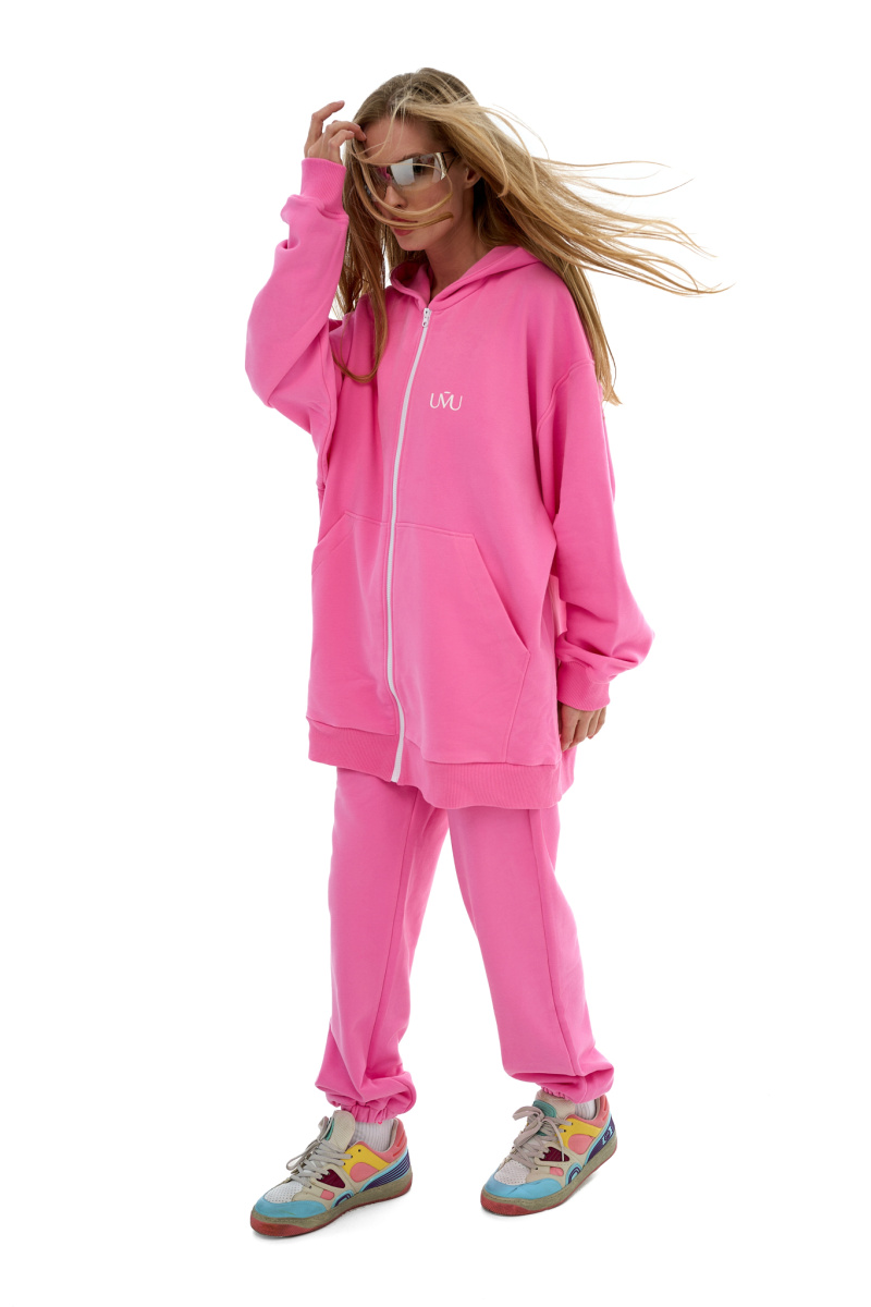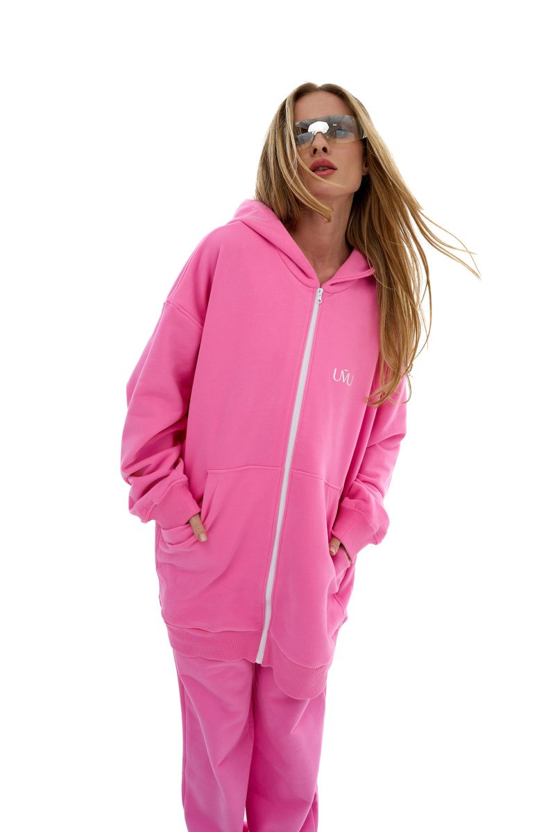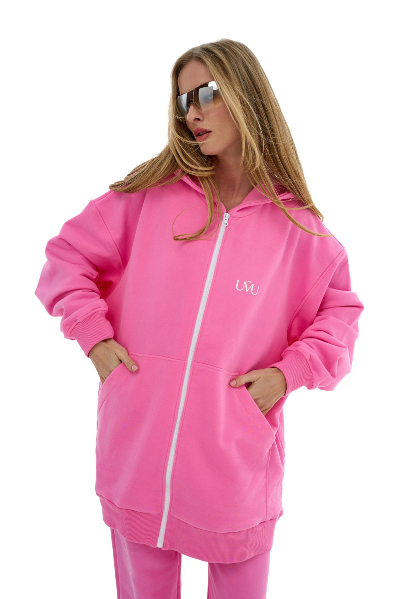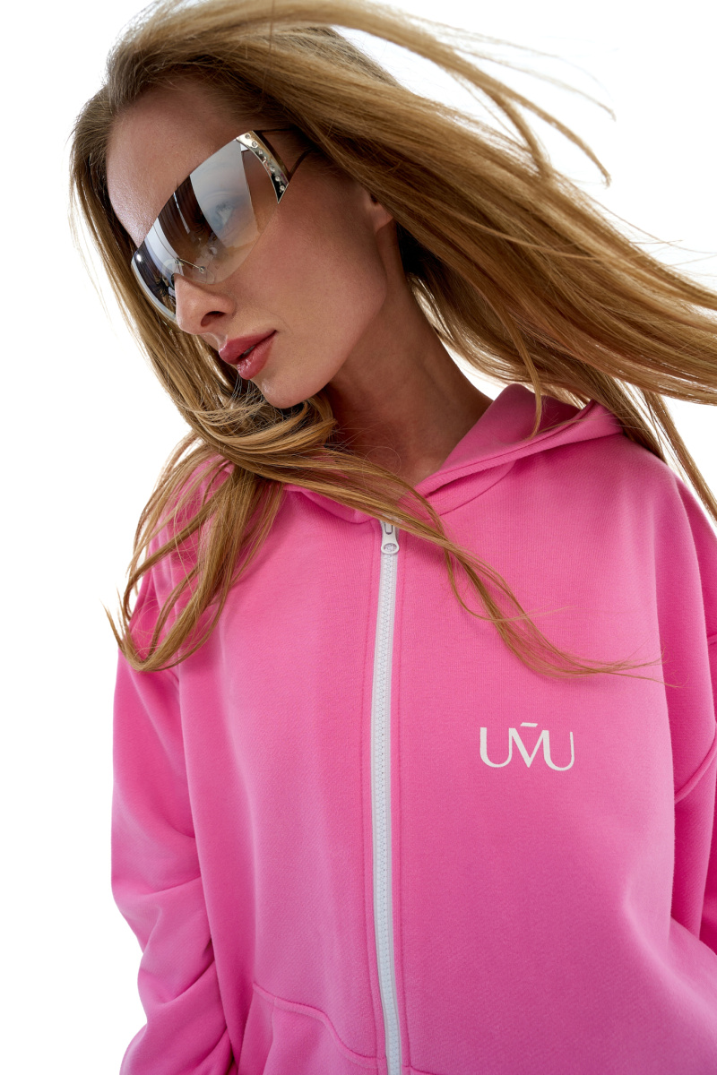 Толстовка в взрывном розовом оттенке с белой фурнитурой и принтом на спине с надписями UNO MAS UNO и смайлами.