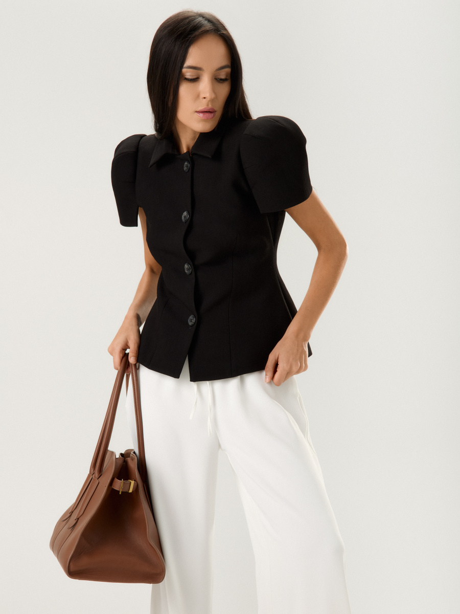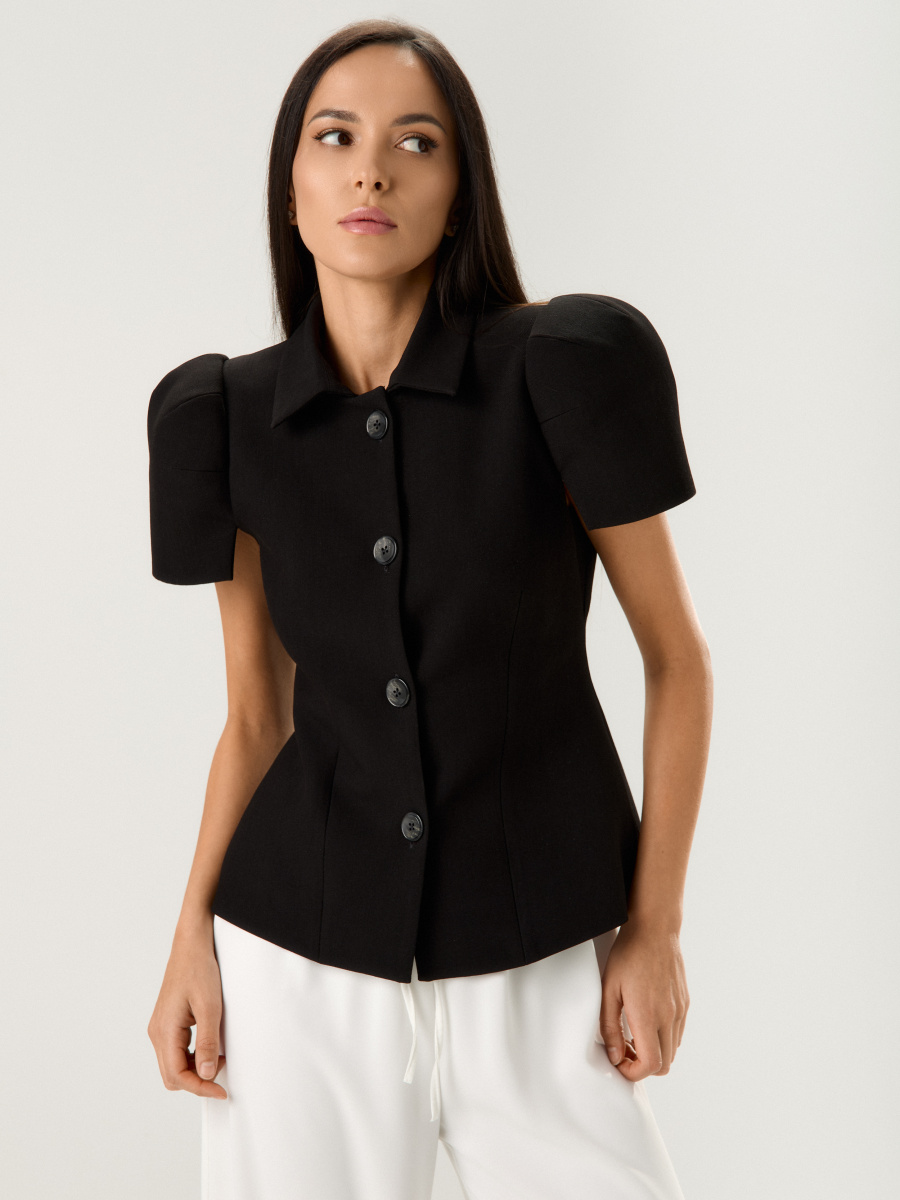Жакет по силуэту песочные часы, подчеркивающий изящность женской фигуры. Дизайнерский рукав - колокольчик, короткий. Горловина обработана рубашечным воротником. По переду и спинке талиевые вытачки. По переду застёжка на петли-пуговицы. Жакет на подкладке.
