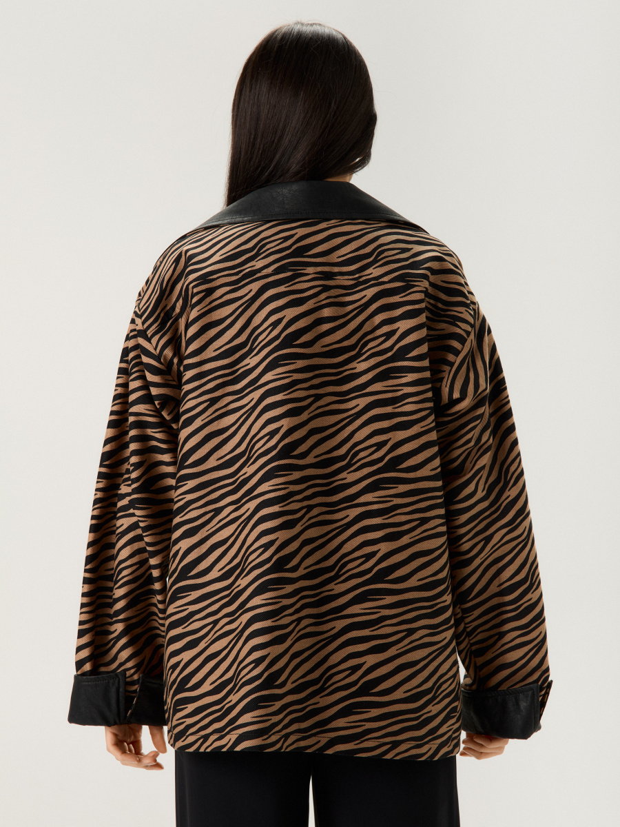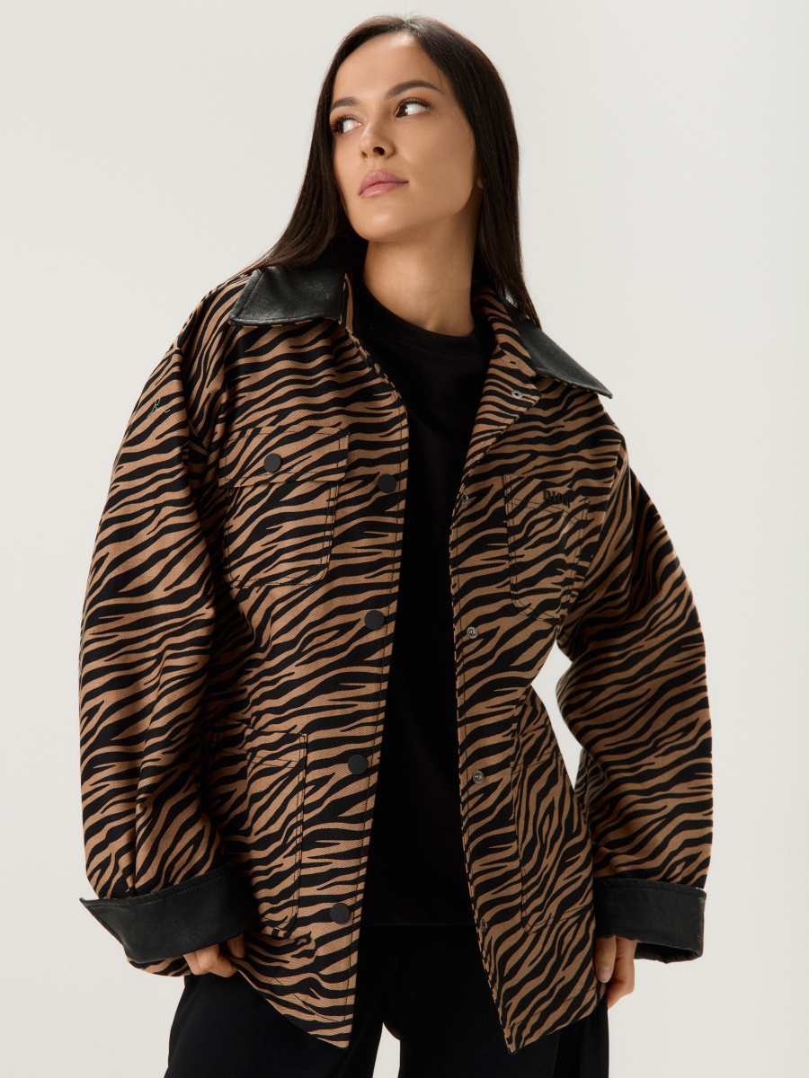 Рубашка прямого свободного кроя, длинная. Спущенное плечо, длинный рукав с двойным манжетом, без застёжки. Воротник фигурный, на стойке. Застёжка на кнопки. По переду накладные карманы по линии груди и по линии талии, над правым верхним карманом клапан. По спинке кокетка. Рубашка декорирована эко кожей на деталях воротника и манжета.