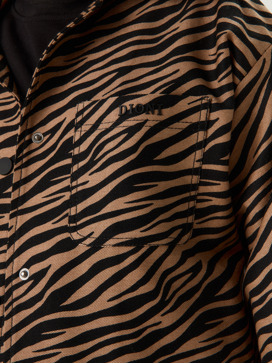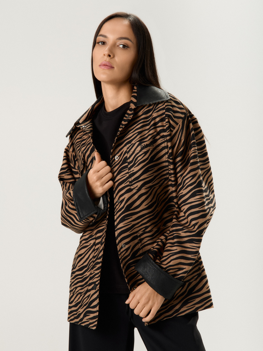 Рубашка прямого свободного кроя, длинная. Спущенное плечо, длинный рукав с двойным манжетом, без застёжки. Воротник фигурный, на стойке. Застёжка на кнопки. По переду накладные карманы по линии груди и по линии талии, над правым верхним карманом клапан. По спинке кокетка. Рубашка декорирована эко кожей на деталях воротника и манжета.