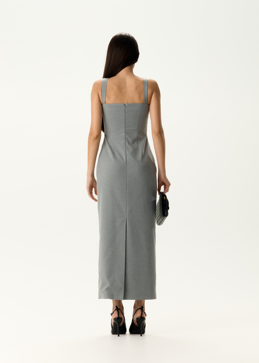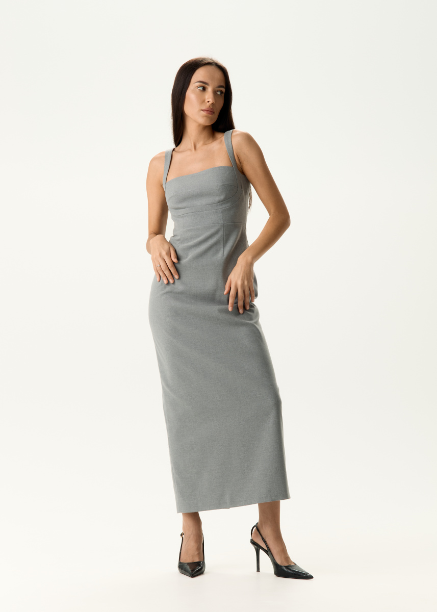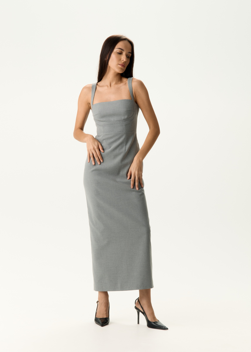 Платье женское прилегающего силуэта, удлинённое, на бретелях (не регулирующихся). По переду отрезной лиф по талии, моделирующий корсетный силуэт. По центральному шву спинки потайная молния и шлица. По спинке талиевые вытачки. Платье на подкладке.