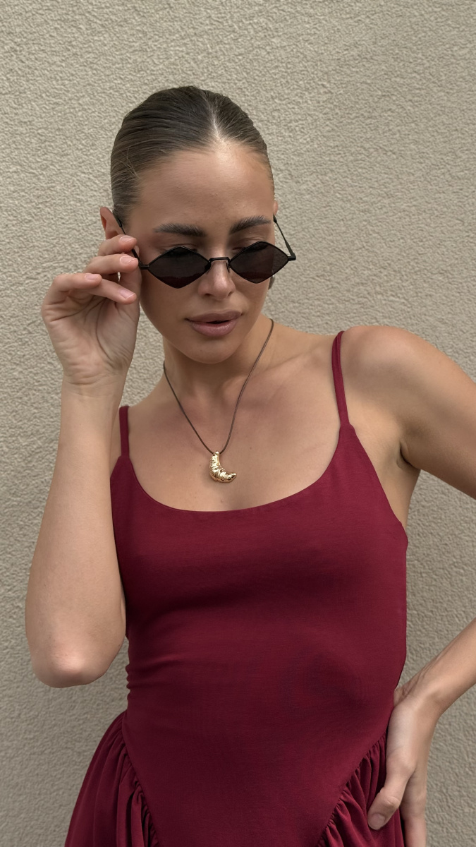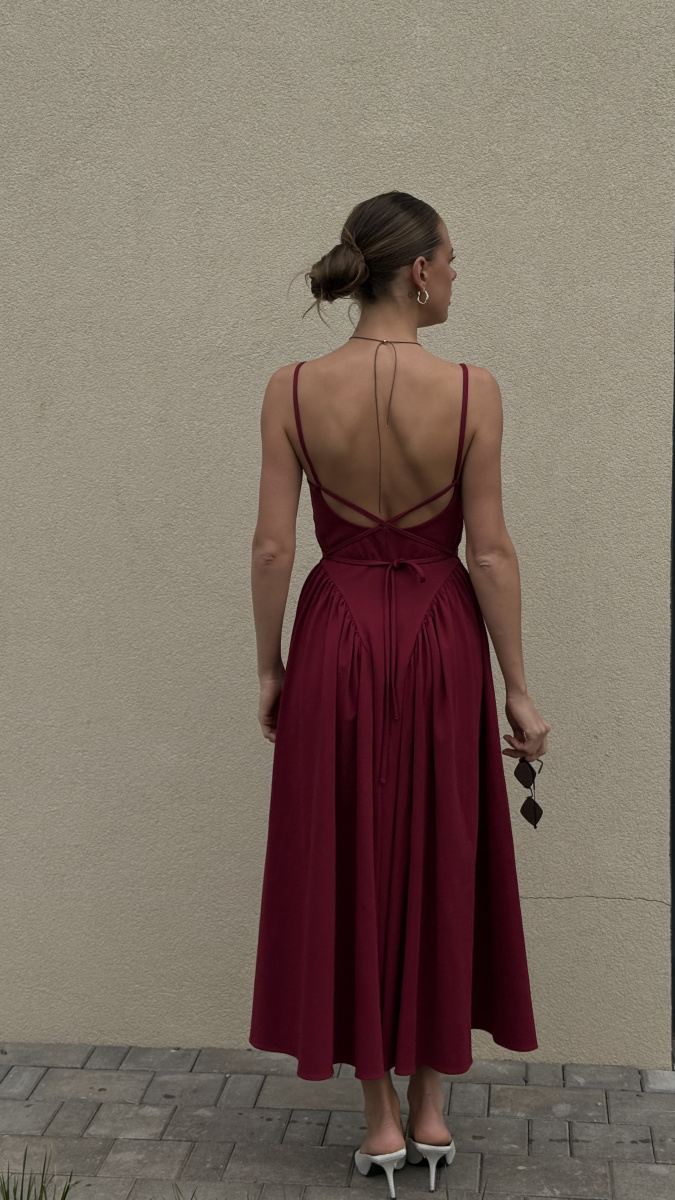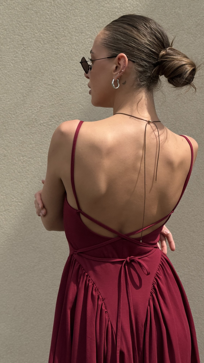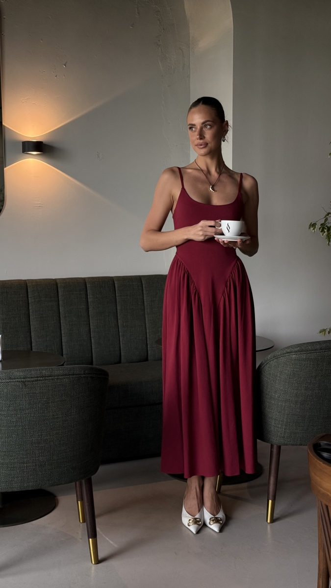 Платье расклешенного силуэта, выполненное из мягкого трикотажного полотна, хорошо растягивается и "садится" на фигуру. Лиф облегающий, двойной, с округлой горловиной, на бретелях. Спинка открытая, на шнуровке. Длина бретелей регулируется. Юбка расширенного силуэта, длинной миди, с округлыми подрезами и сборкой на уровне бедер.