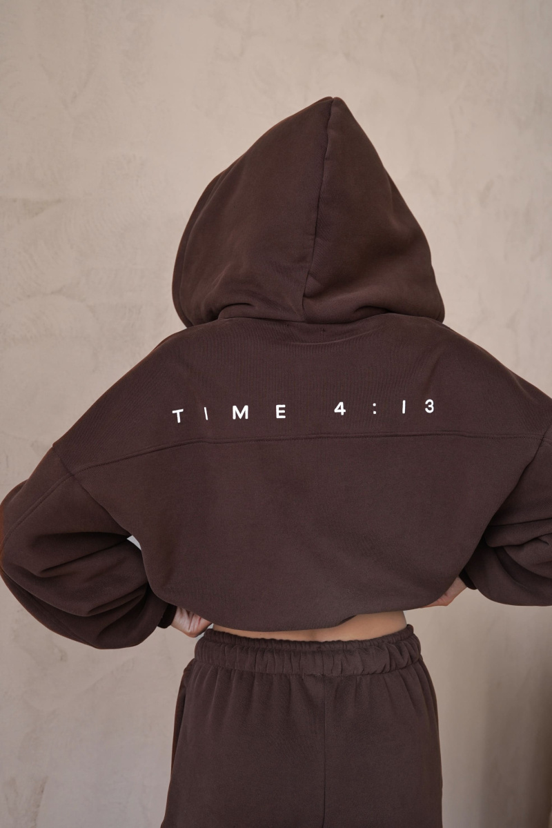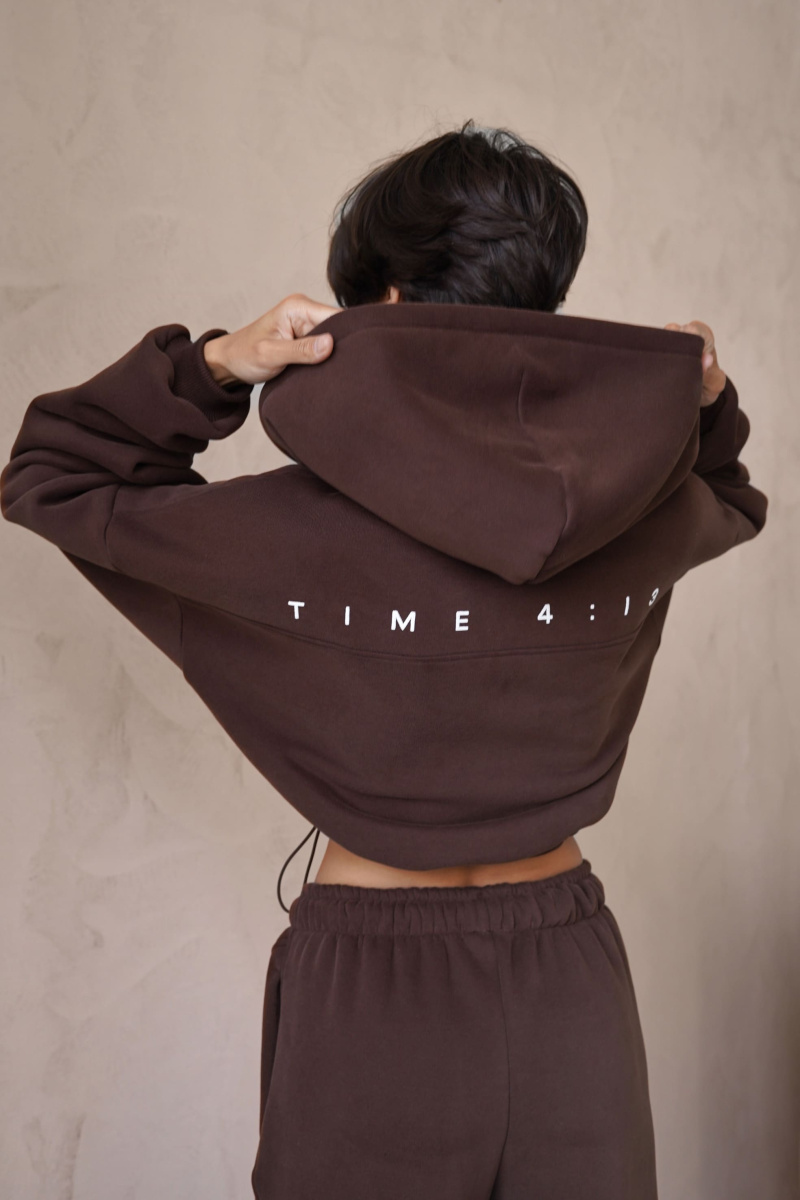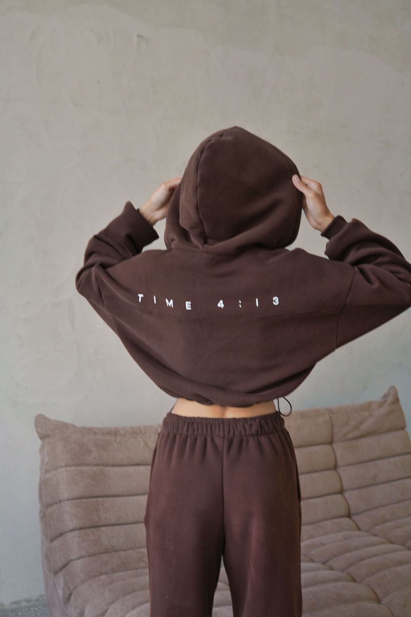 Укороченный крой подчеркивает фигуру, а мягкий начес внутри дарит тепло и уют в прохладные дни. Глубокий объемный капюшон защищает от ветра, а аккуратные манжеты и эластичный регулируемый пояс обеспечивают идеальную посадку. Универсальный дизайн позволяет сочетать худи с джинсами, спортивными штанами или юбкой, создавая непринужденный, модный образ. Стильный минимализм бренда TIME 4:13 делает кроп-худи незаменимым в повседневном гардеробе