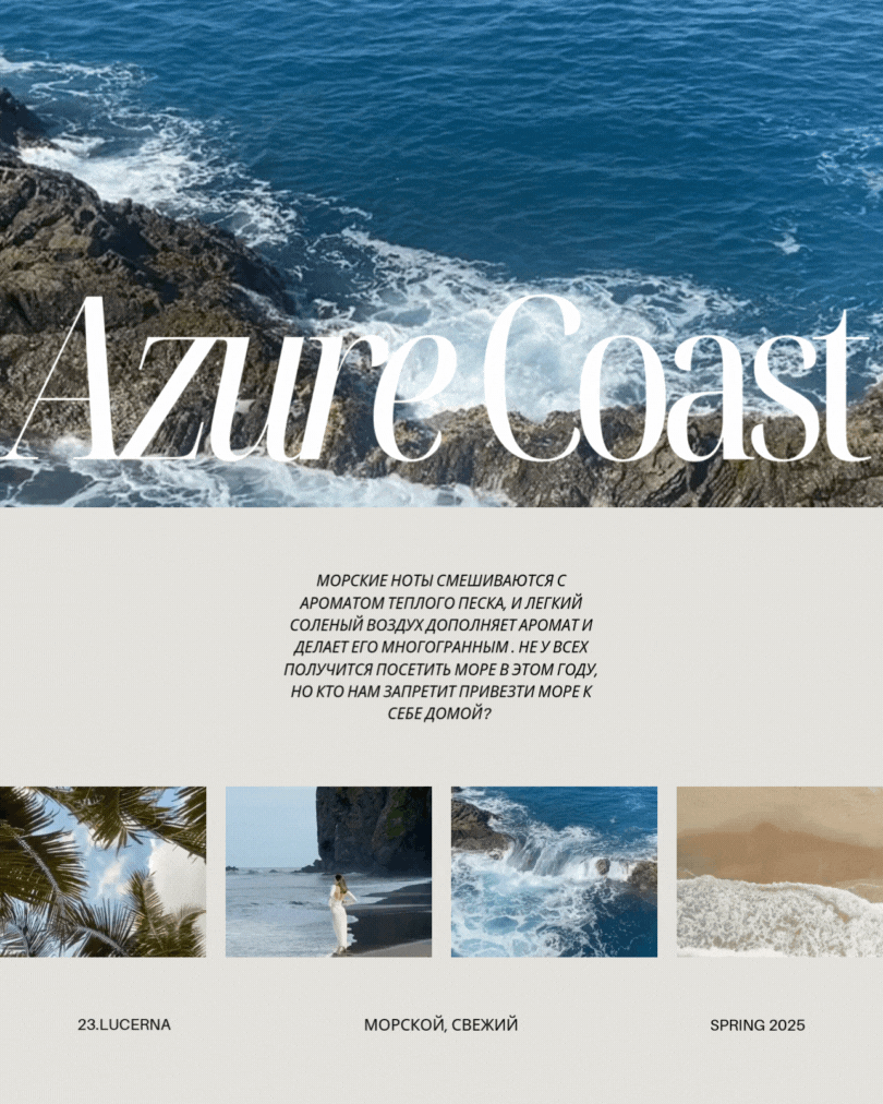 AZURE COAST - "морские ноты смешиваются с ароматом теплого песка, легкий соленый воздух дополняет аромат и делает его многогранным. Не все успели посетить море в этом году, но кто нам запретит привезти море к себе домой?"