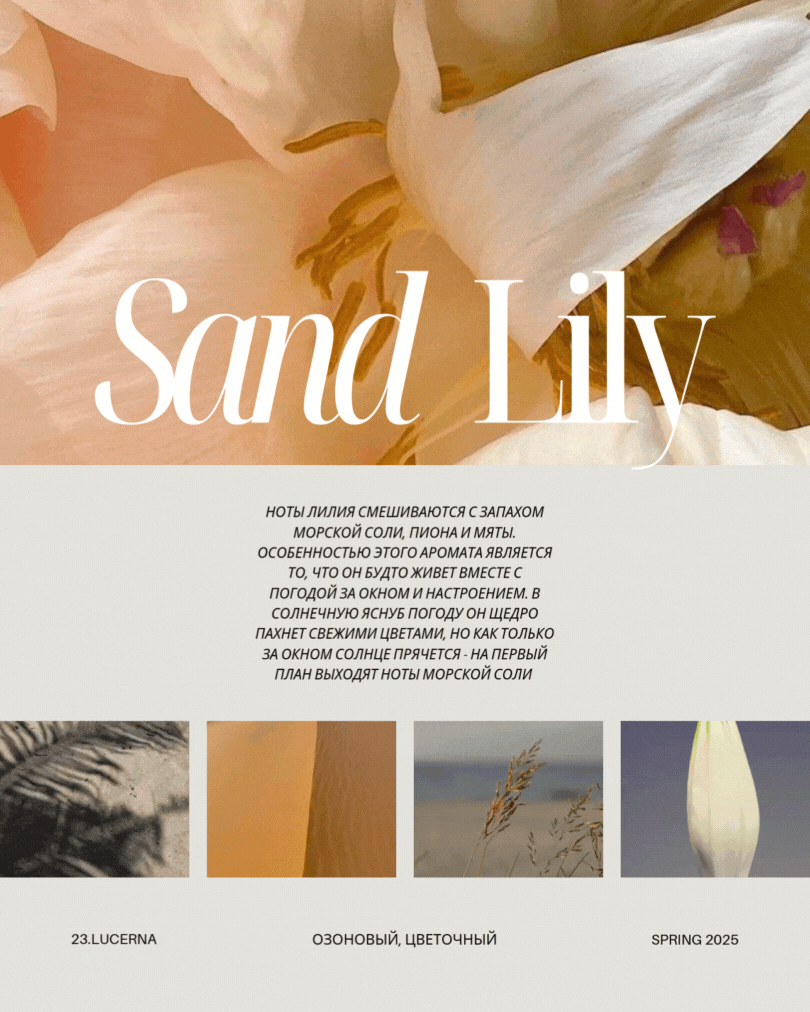 SAND LILY - ноты лилии смешиваются с запахом морской соли, пиона и мяты. Особенностью этого аромата является то, что он будто живет вместе с погодой за окном и настроением. В солнечную ясную погоду он щедро пахнет свежими цветами, но как только за окном солнце прячется - на первый план выходят ноты морской соли