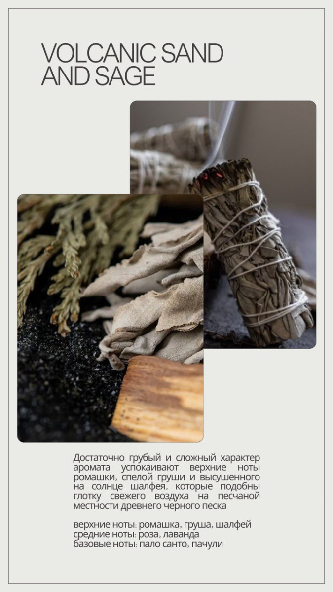 Volcanic Sand and Sage — это сочетание землистых и свежих нот, передающее атмосферу дикой природы. Аромат открывается теплыми оттенками вулканического песка, дополняемыми травянистой свежестью шалфея. Эта композиция создаёт ощущение спокойствия и гармонии, идеально подходя для медитации или релаксации дома.