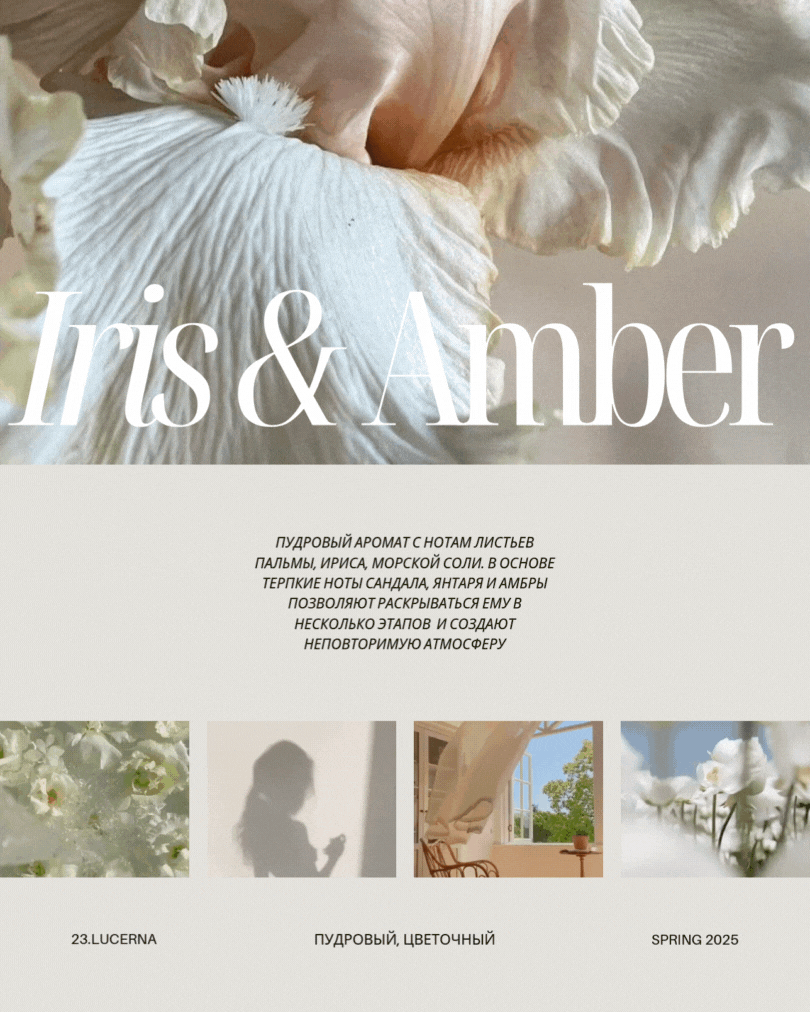 IRIS and AMBER - пудровый аромат с нотами листьев пальмы, ириса, морской соли. В основе терпкие ноты сандала, янтаря и амбры позволяют ему раскрываться в несколько этапов и создают теплую атмосферу вокруг себя.