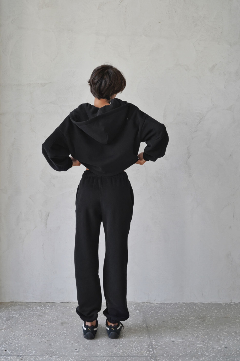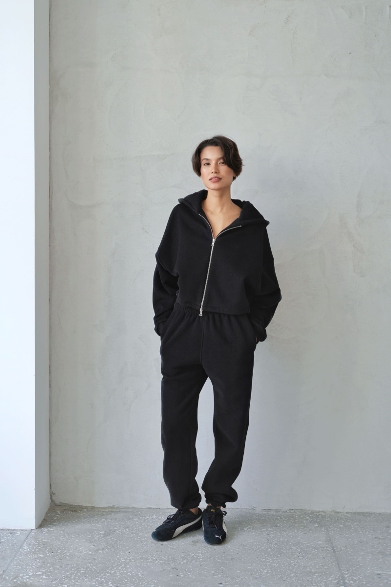 Брюки джоггеры из футера трехнитки с велюровым эффектом и начесом с отстроченной резинкой и шнурком на высокой посадке, карманами в боковых швах, по бокам объемные декоративные швы.