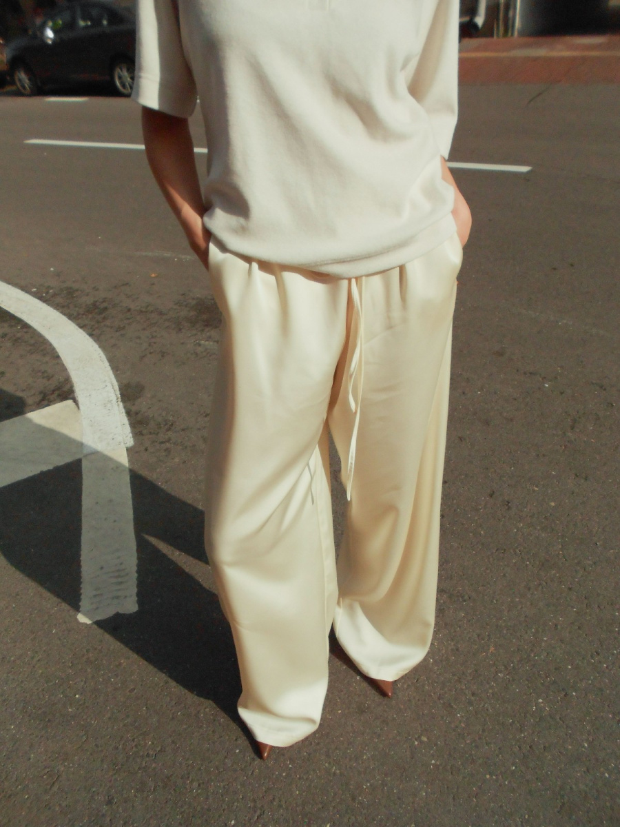 Базовый элемент коллекции — широкие брюки в цвете сливочное масло.