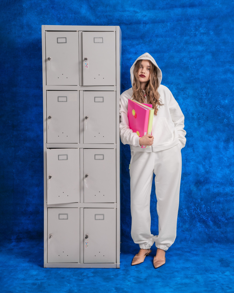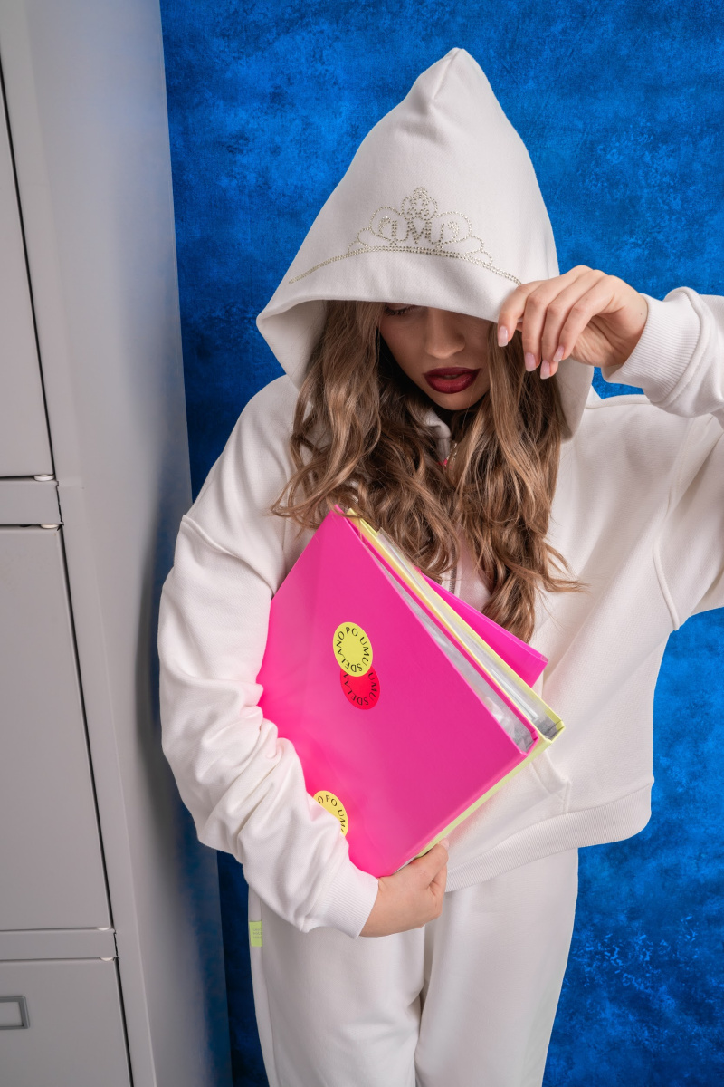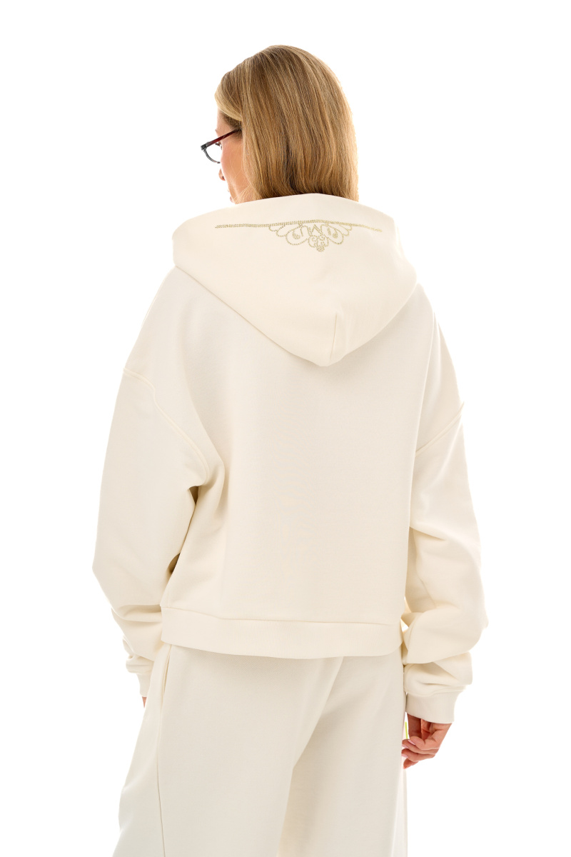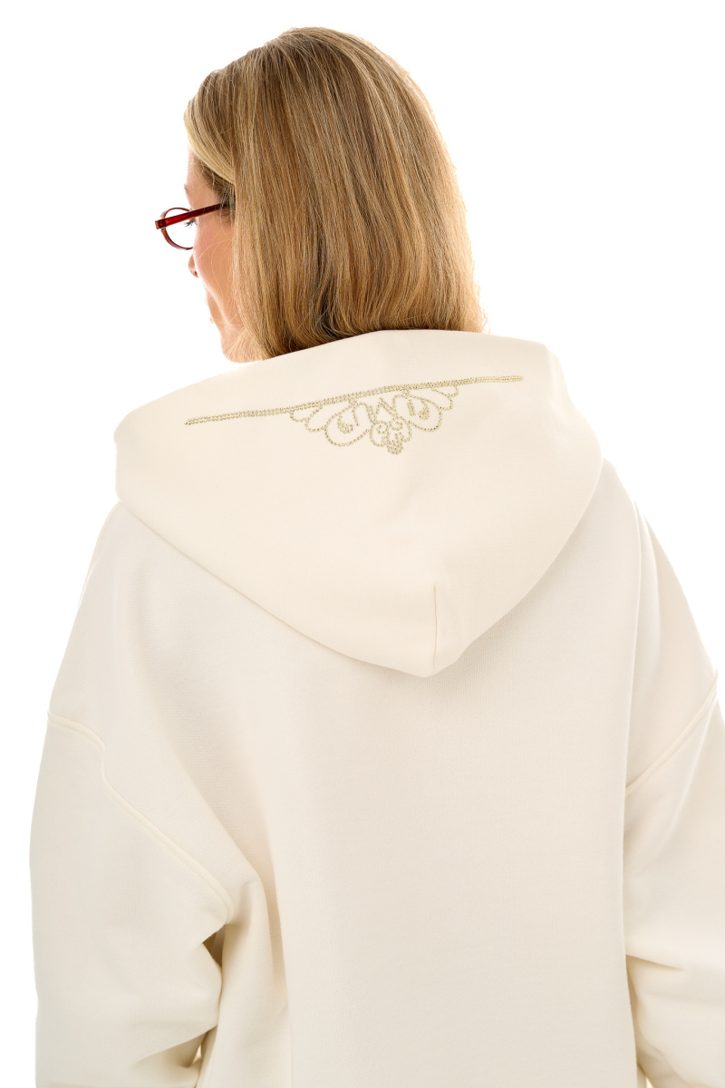 Молочная толстовка с диадеммой на капюшоне из золотых страз.