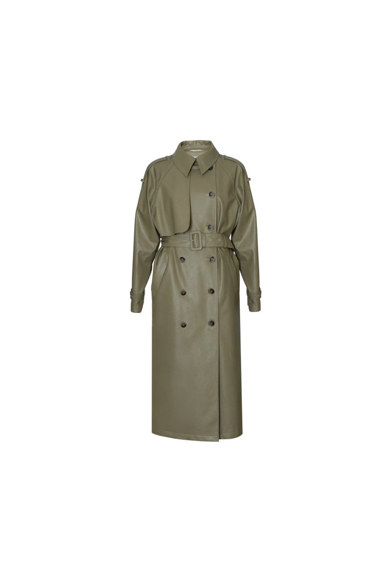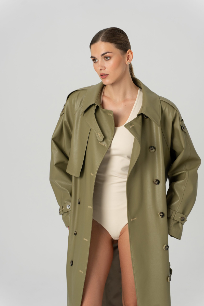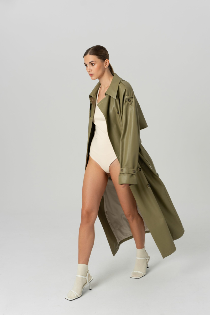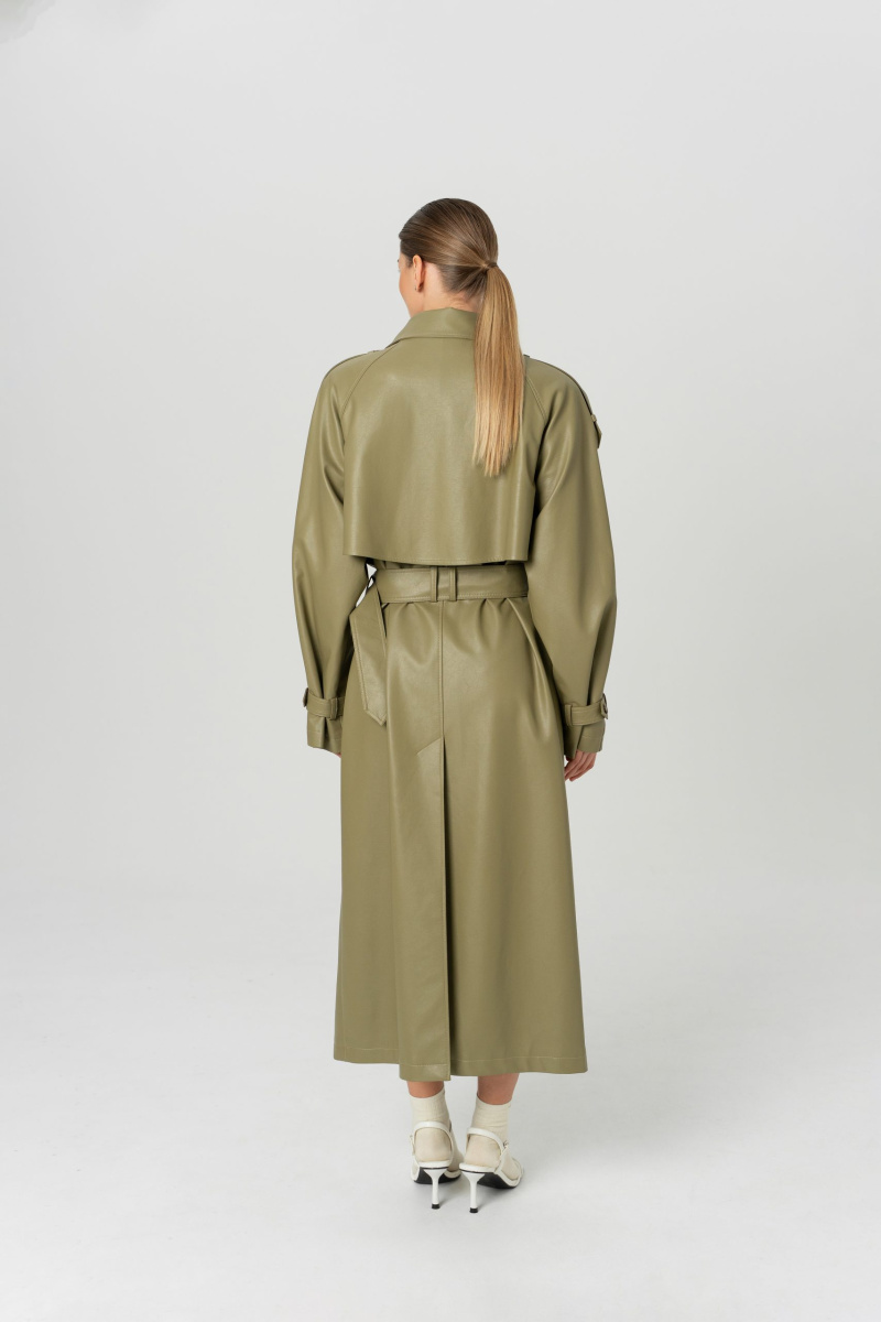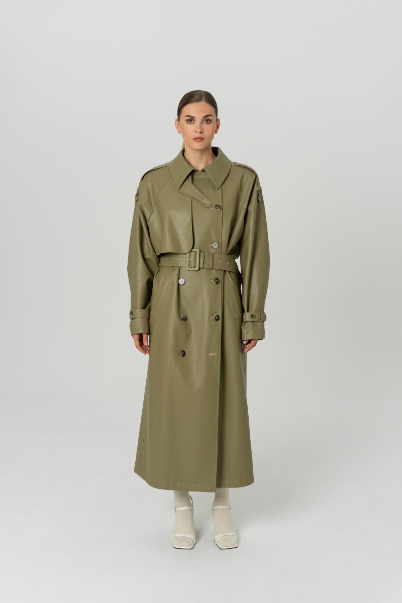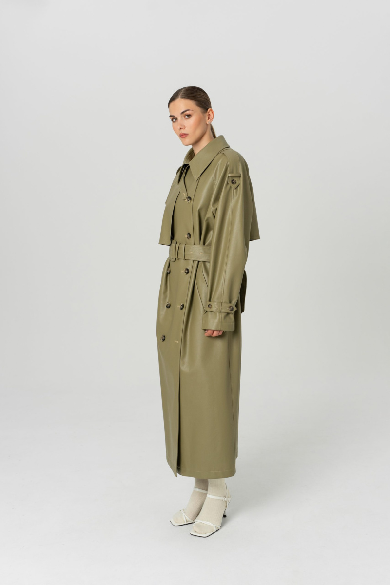 Двубортный детализированный тренч макси цвета Matcha. Рукава с регулируемыми патами на манжетах, мягкая линия плеч, рукав реглан, сложная кокетка впереди и фигурная кокетка на спинке. Регулируемый пояс с квадратной пряжкой. Тренч имеет сложную составную подкладку: основная изготовлена из мягкой поливискозы, в рукавах предусмотрена специальная подкладка в полоску.