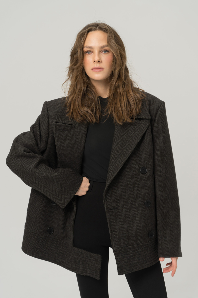 Пальто плотное и держит форму, в то же время обладая пластичностью. Характерными особенностями являются: расширенный рукав, глубокие карманы и классическая двубортная застежка.