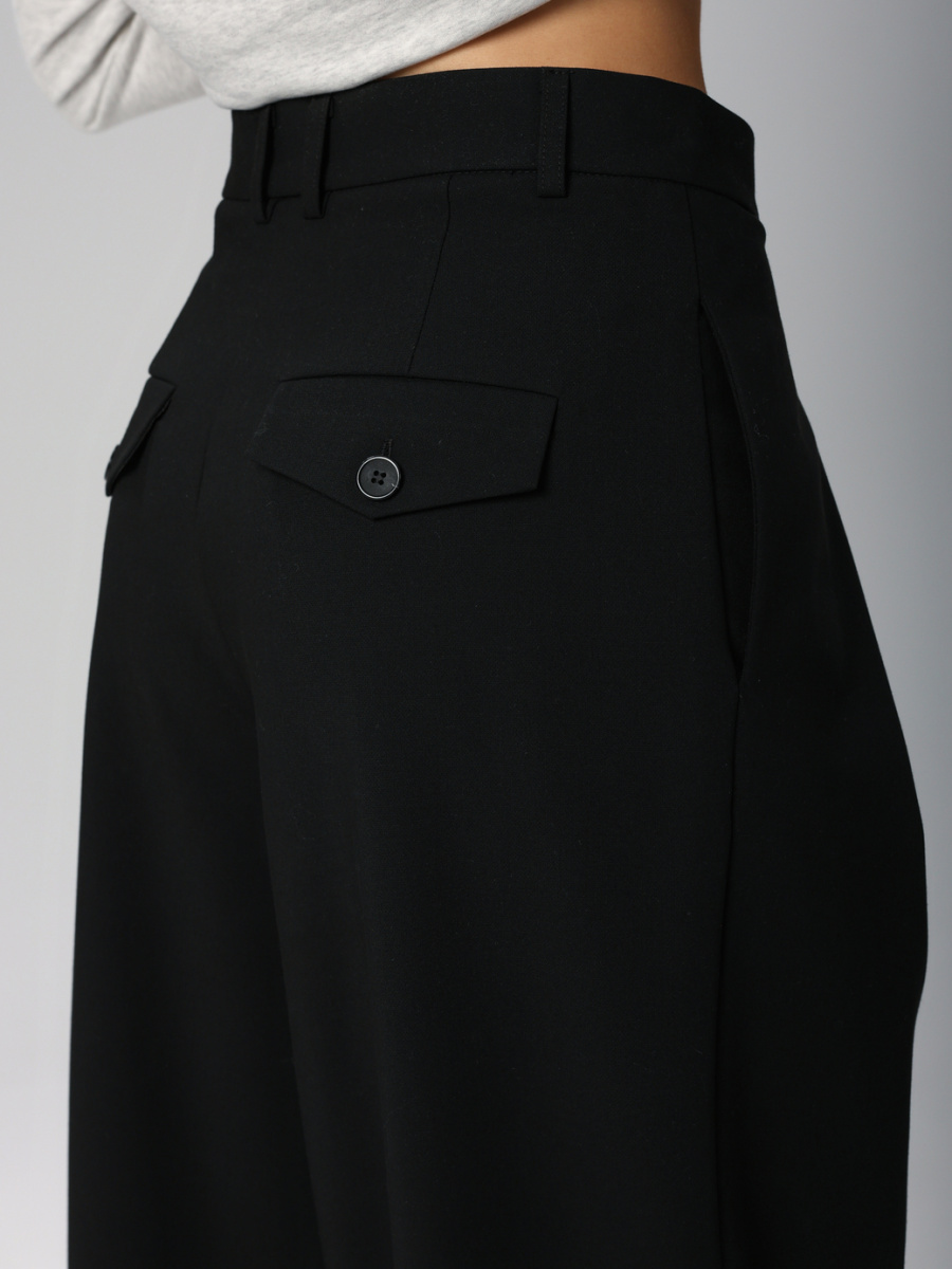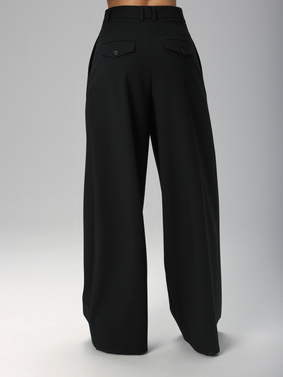 Классические брюки выполнены из костюмной ткани. Брюки палаццо со шлевками для ремня и удобными боковыми карманами. Задняя часть брюк с прорезным карманом.