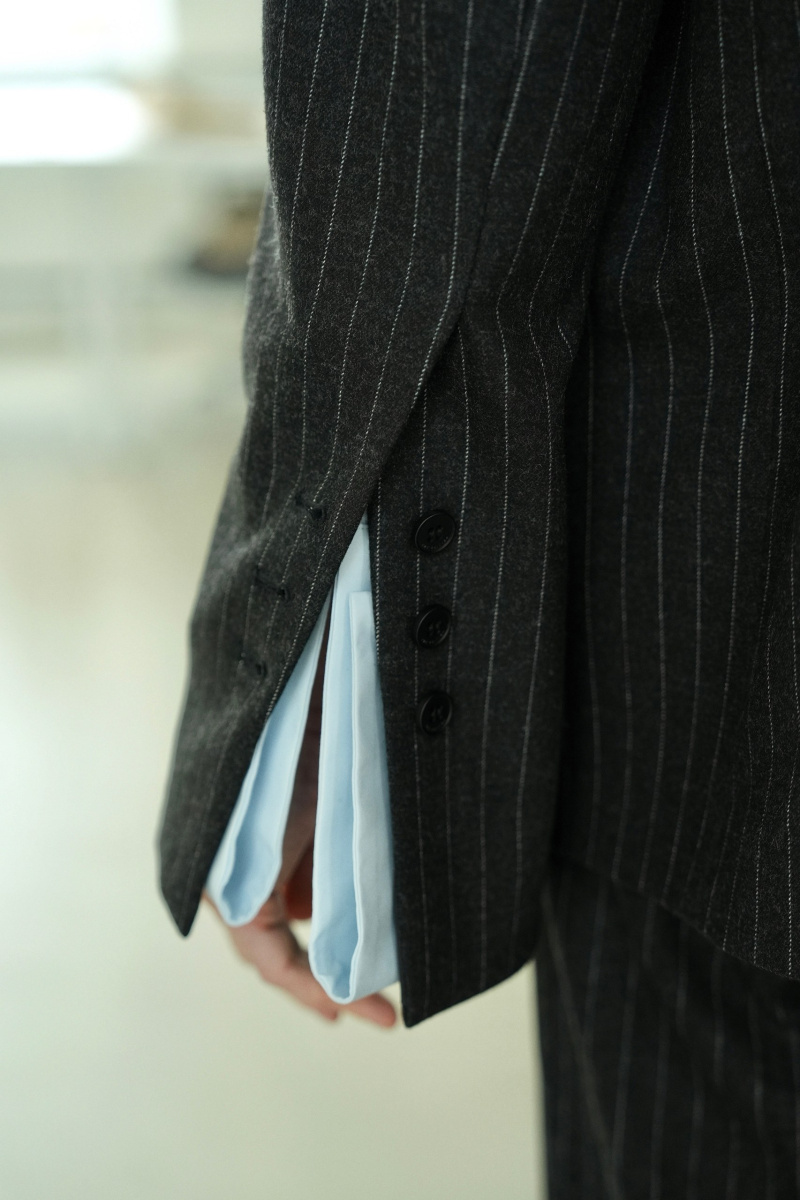 Пиджак из плотной шерсти в полоску будет идеален для ваших деловых встреч, где вы  будете решать судьбы многомиллионных контрактов. Костюм из этой ткани точно должен быть у каждой selfmade woman. Плотная шерсть и тенсел добавляют образу структуру и мягкость одновременно, так же, как ваша харизма сочетает строгость и легкость.