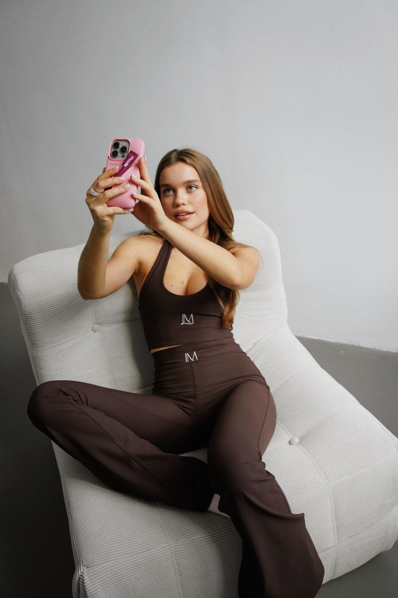 Комфортная посадка и мягкий материал обеспечивают свободу движений, а минималистичные детали добавляют уникальности. Представлен в комплекте с леггинсами клёш и рашгардом для создания цельного повседневного и спортивного образа