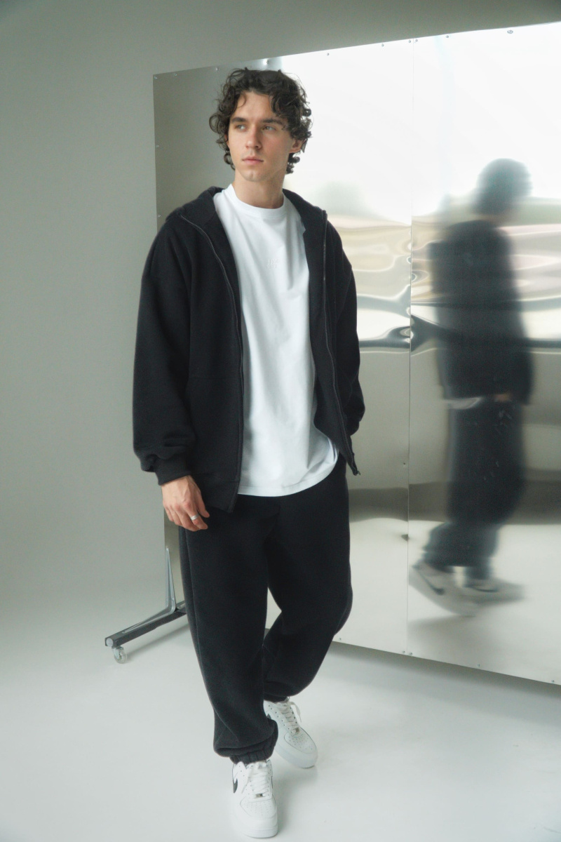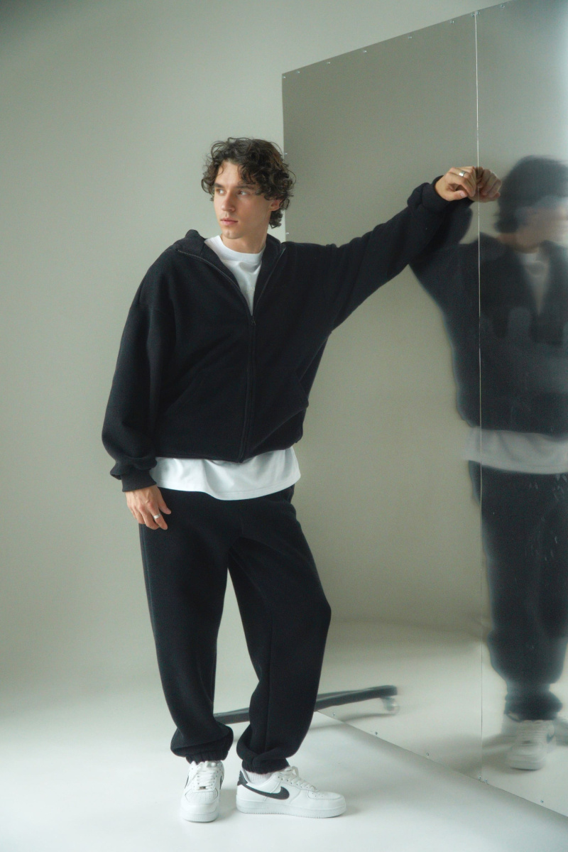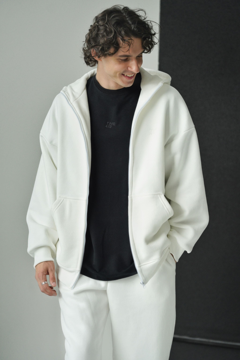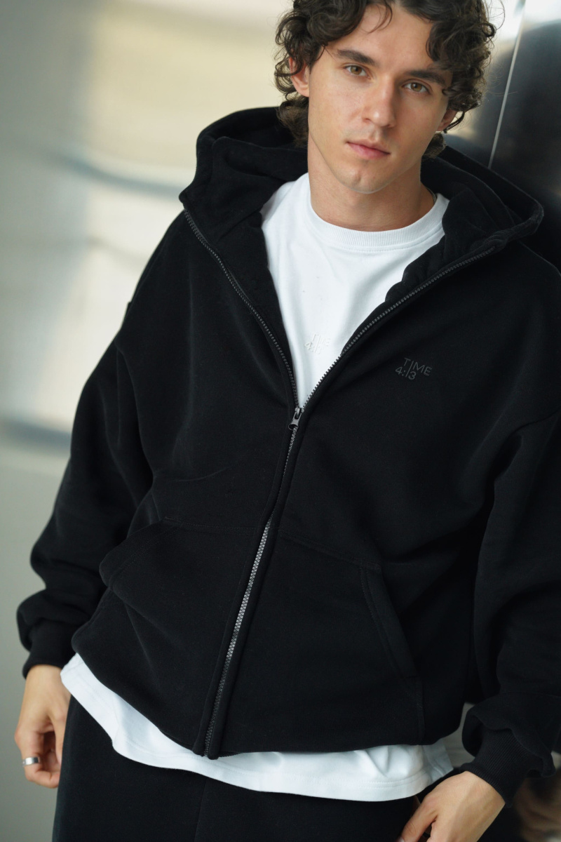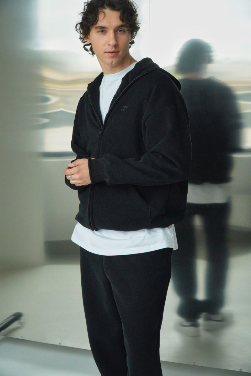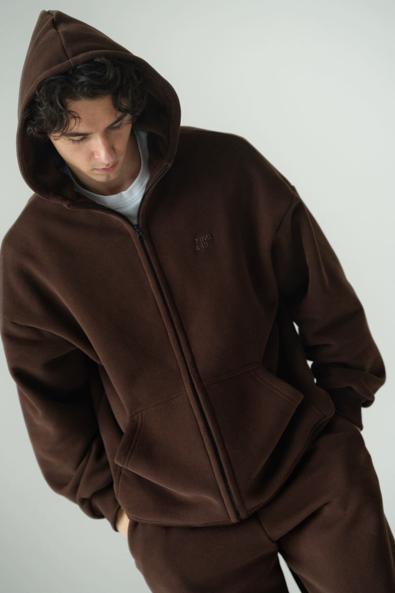 Худи oversize из футера трехнитки с велюровым эффектом с начесом, линия плеча спущена, пластиковая фурнитура скрыта объемным швом, воротник выполнен стойкой с объемным капюшоном, два накладных кармана расположены по переду, по низу и рукавам мягкая резинка-кашкорсе, выпуклый логотип расположен на груди.