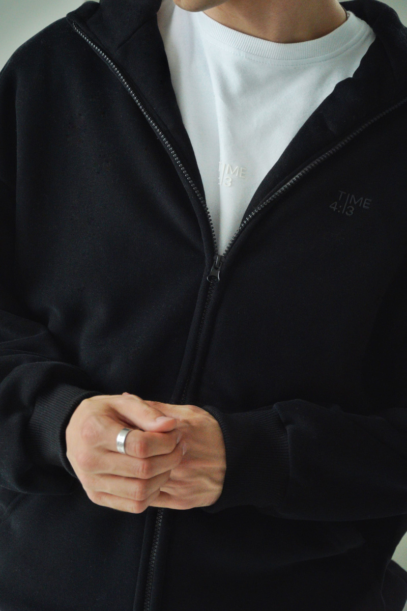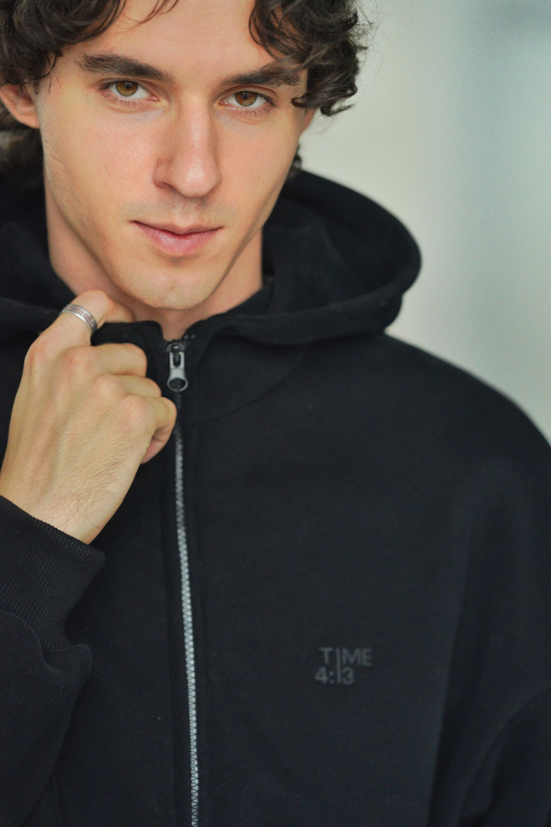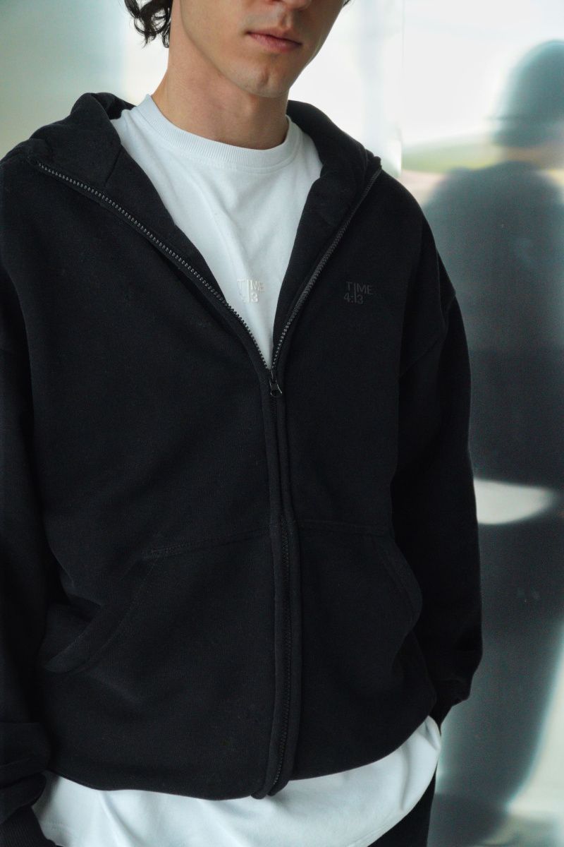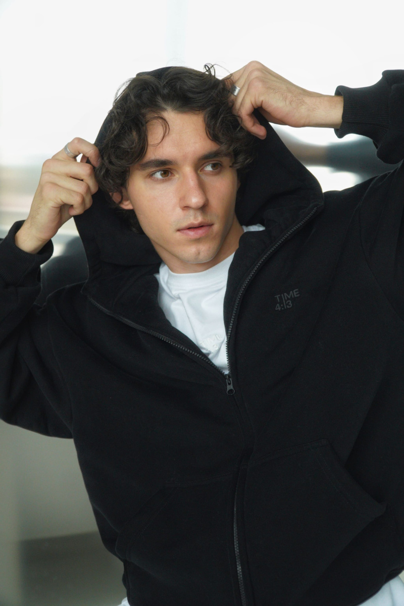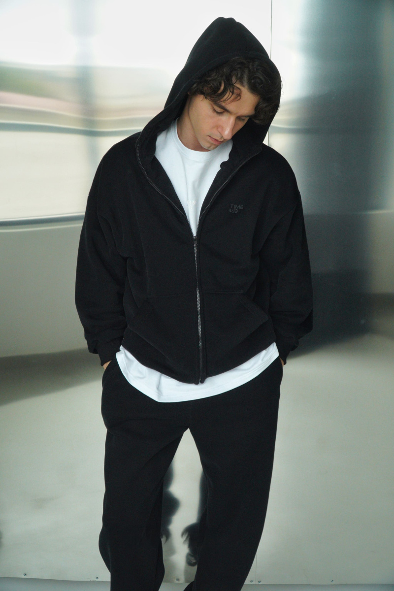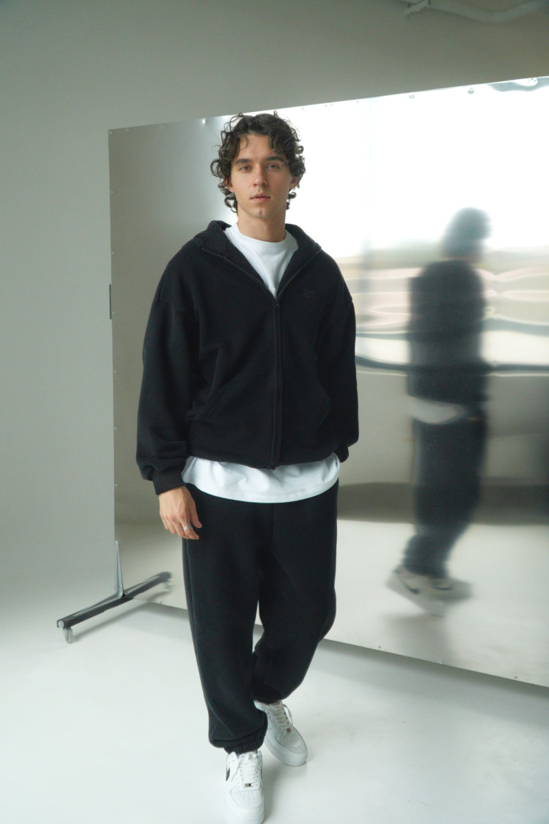 Худи oversize из футера трехнитки с велюровым эффектом с начесом, линия плеча спущена, пластиковая фурнитура скрыта объемным швом, воротник выполнен стойкой с объемным капюшоном, два накладных кармана расположены по переду, по низу и рукавам мягкая резинка-кашкорсе, выпуклый логотип расположен на груди.