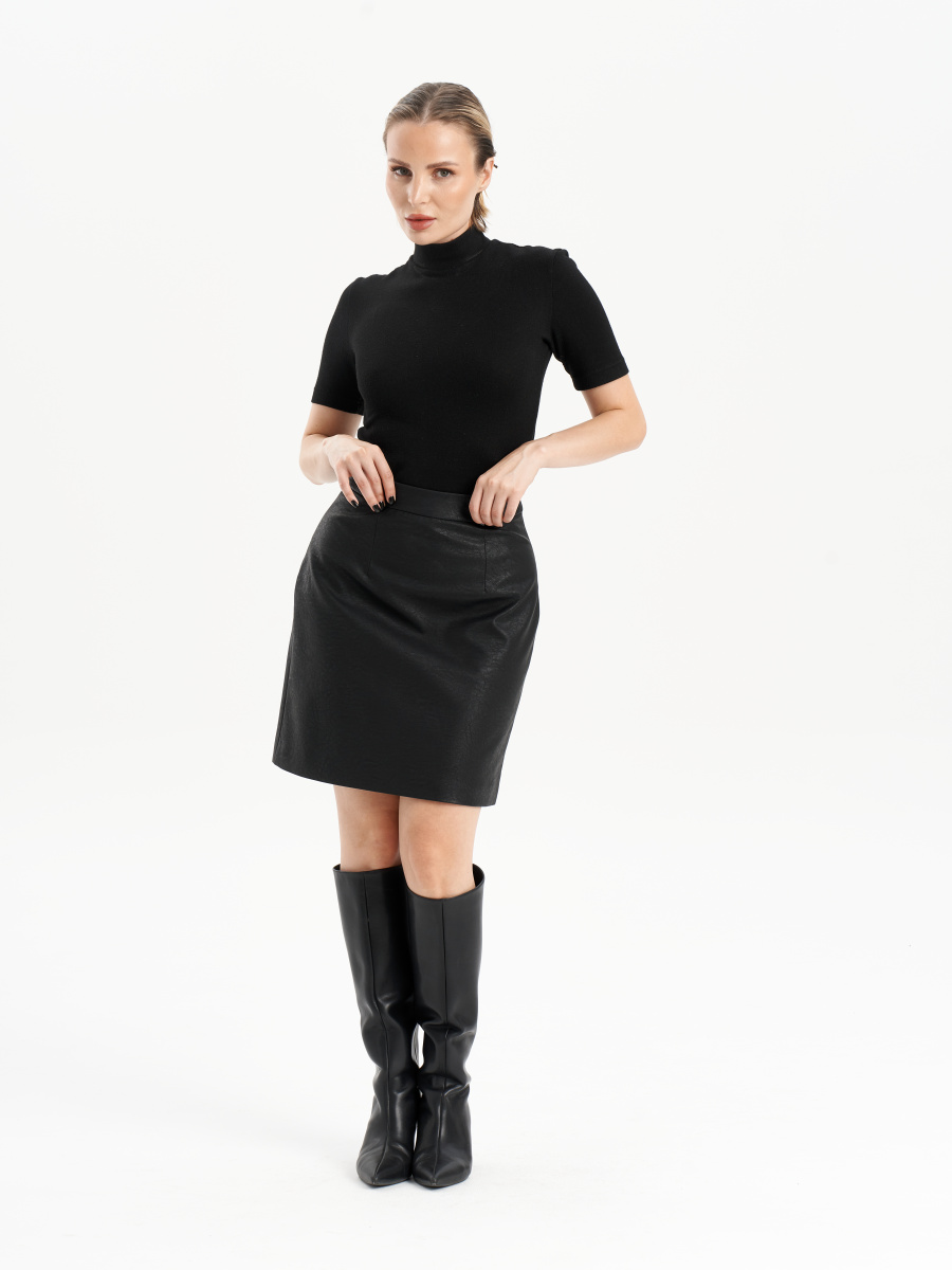 Юбка женская прямого силуэта,  короткая. На подкладке. Линия талии обработана обтачками. По центральному шву спинки потайная молния.