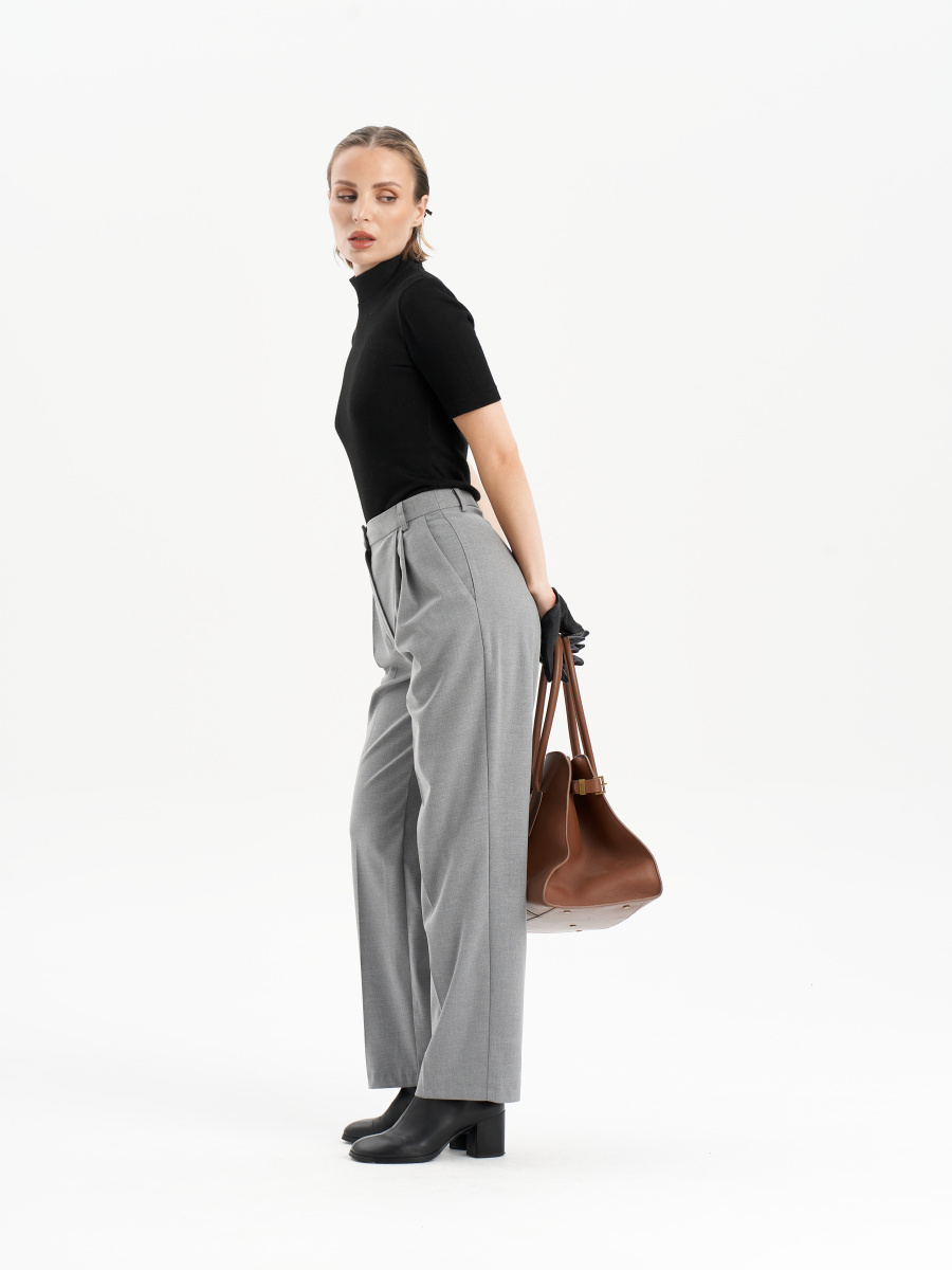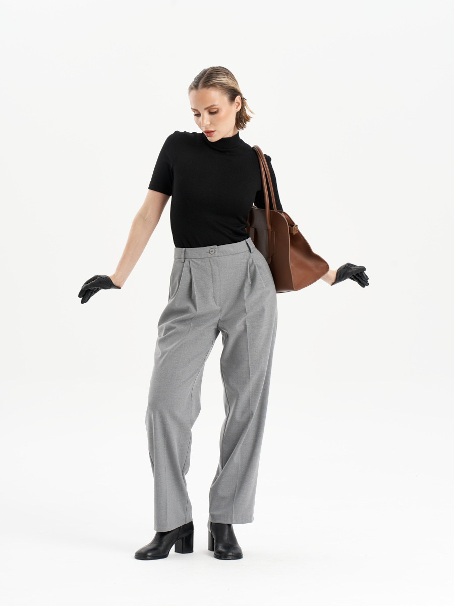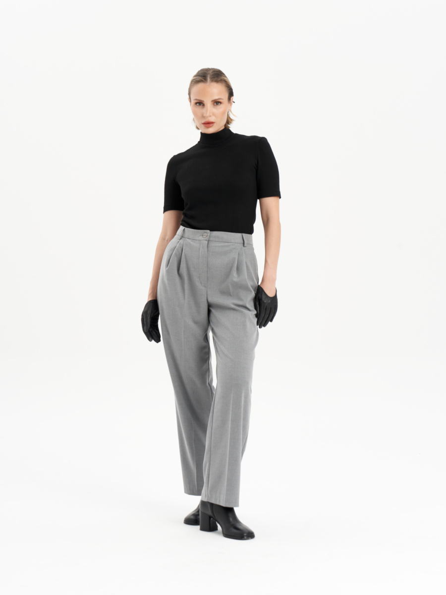 Брюки женские прямого силуэта, длина до щиколотки . По линии талии переда 2 защипа, заутюженная стрелка, боковые карманы. Застёжка на молнию (с гульфиком), Пояс на петлю пуговицу.