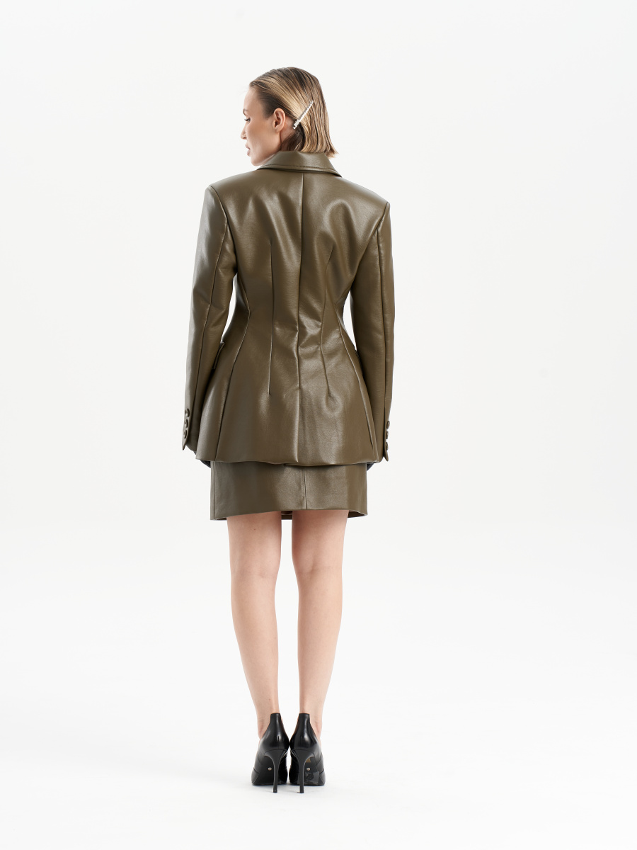 Жакет приталенного силуэта, длина ниже линии бедра. Застежка по переду на 3 петли-пуговицы. По переду жакета прорезные карманы с фигурным клапаном, слева вверху декоративный карман-листочка. По центральному шву спинки шлица. Рукав втачной, длинный, с декоративной шлицей. Горловина обработана воротником, по переду лацкан.