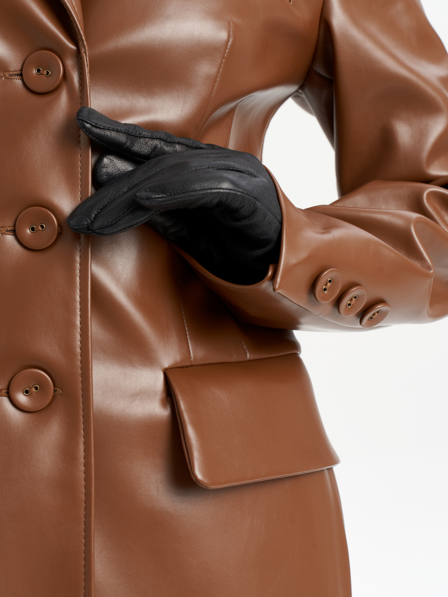Жакет приталенного силуэта, длина ниже линии бедра. Застежка по переду на 3 петли-пуговицы. По переду жакета прорезные карманы с фигурным клапаном, слева вверху декоративный карман-листочка. По центральному шву спинки шлица. Рукав втачной, длинный, с декоративной шлицей. Горловина обработана воротником, по переду лацкан.