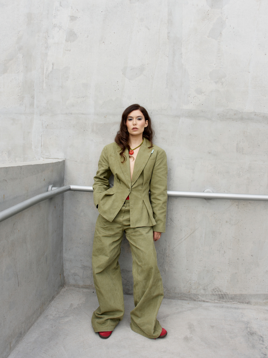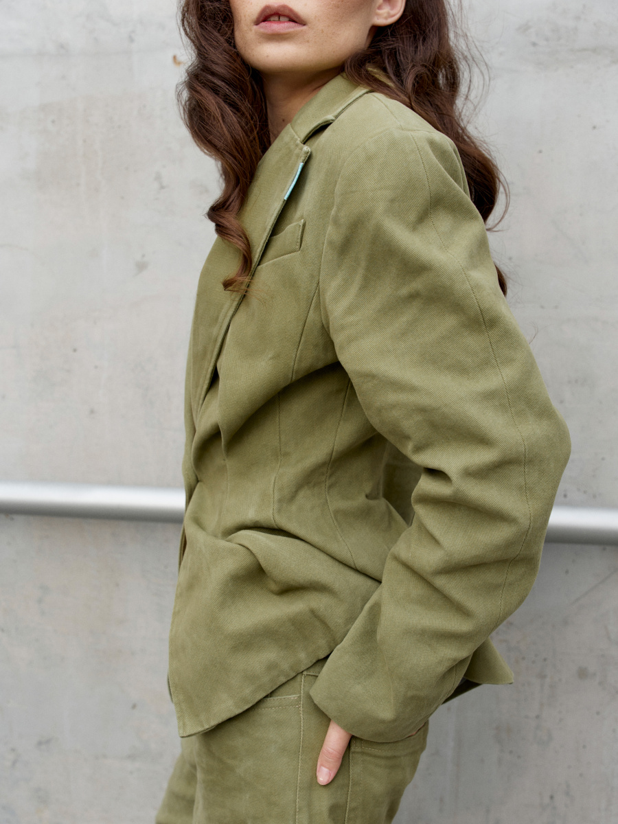 Жакет с немного приспущенной линией плеч, широкие джинсы и зеленый цвет сочного яблока.