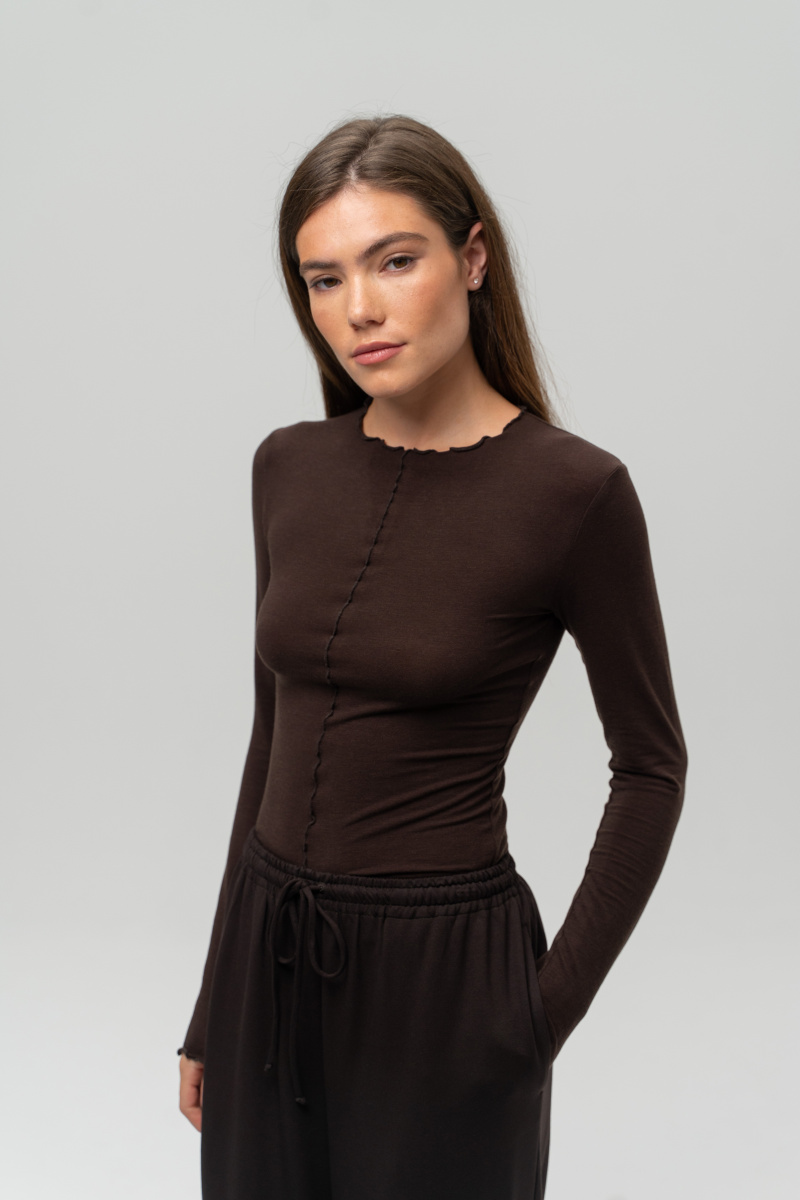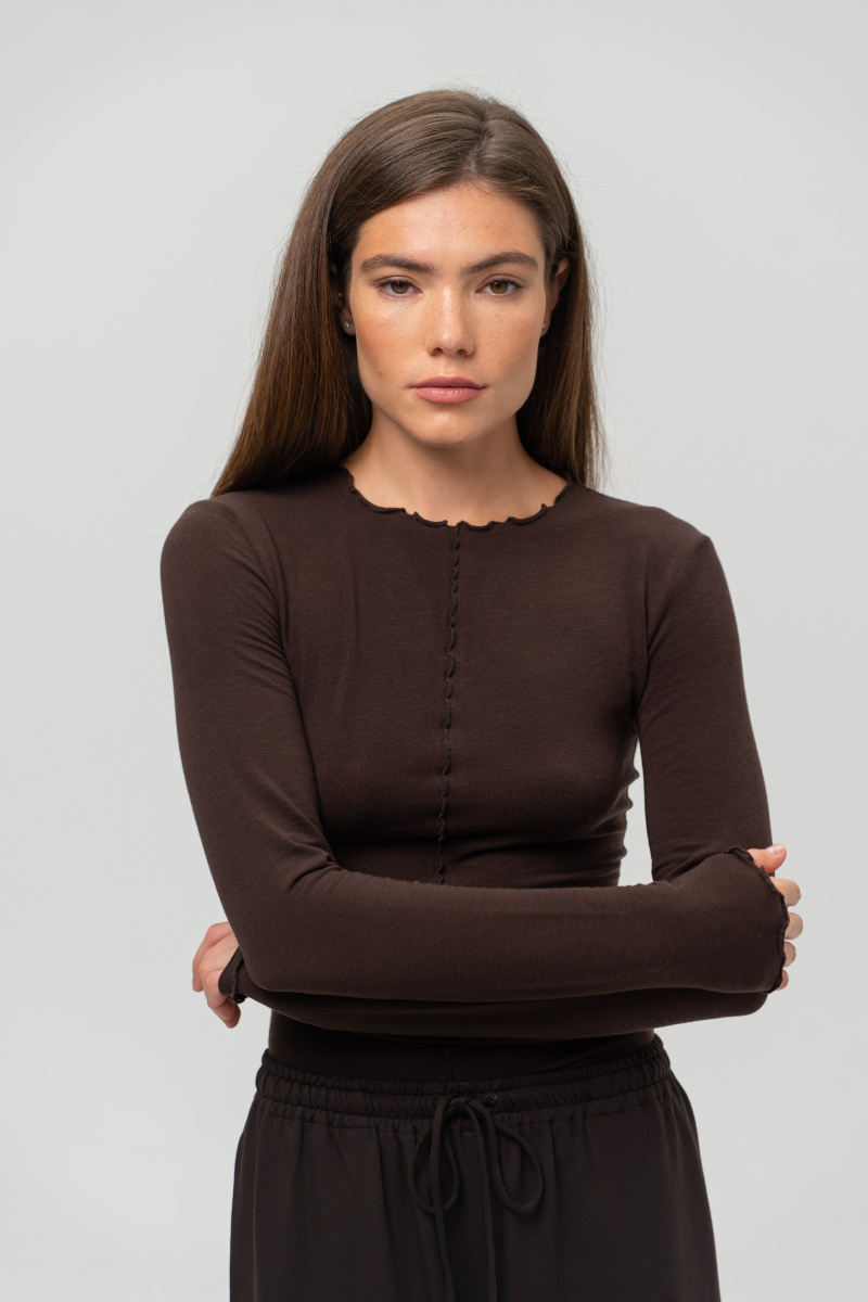 Лонгслив из нежного трикотажа выполнен из тенсела с добавлением шерсти. Изделие дышит и окутывает вас нежностью, при этом дарит тепло. Края изделия обработаны специальным швом, что добавляет еще больше нежности и утонченности изделию.