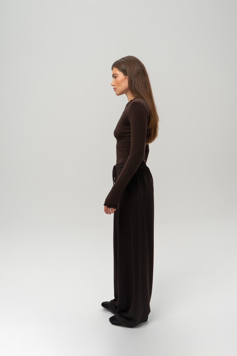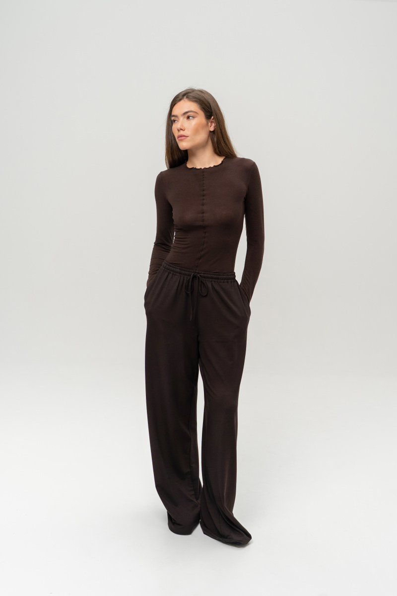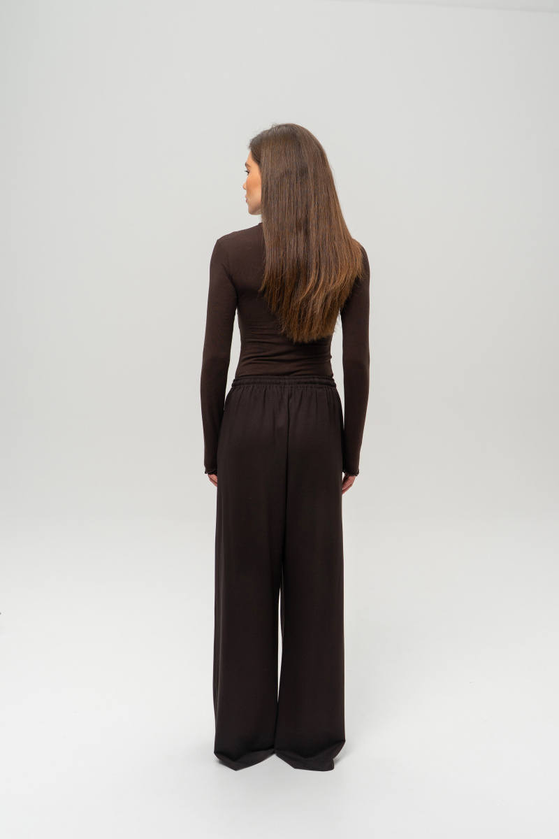 Брюки из дропа Balance в цвете шоколад. Изготовлены из нежного тенсела. За счет добавления тонких нитей эластана изделие хорошо тянется и струится, повторяя каждое движение тела. Низкая пиллингуемость, но при прямом и часто трении аксессуары и другие предметы могут оставлять пилли.
