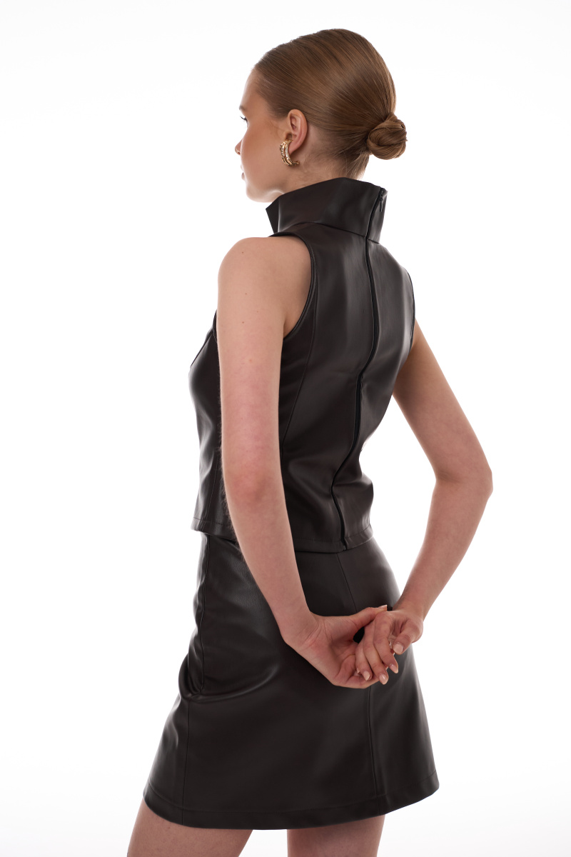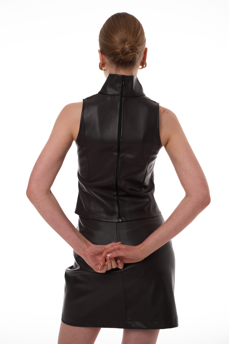 Облегающий топ с аккуратной высокой горловиной, выполненный из качественной экокожи. Чистые линии фасона создают утонченный минималистичный образ. Практичная застежка-молния на спине скрыта от взгляда, сохраняя целостность силуэта. Идеальная основа для создания как строгих, так и неформальных луков благодаря нейтральной палитре и безупречному крою.