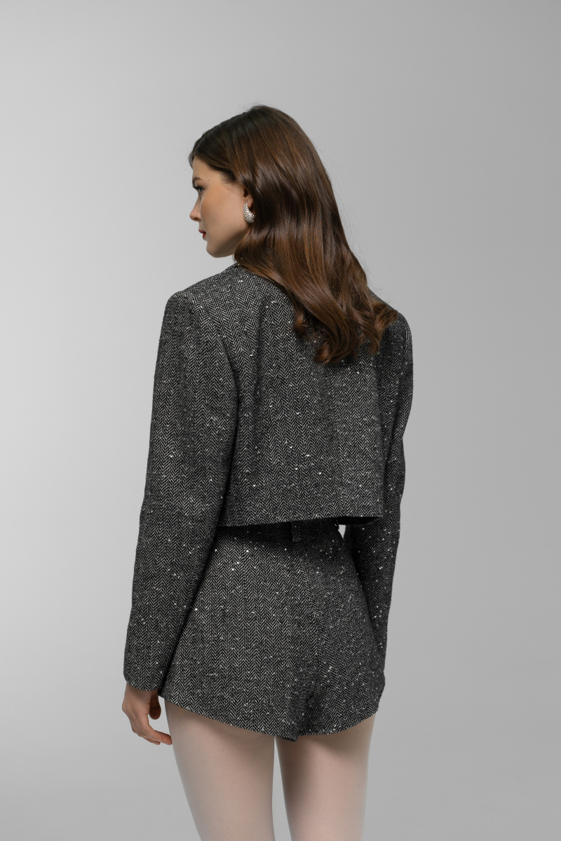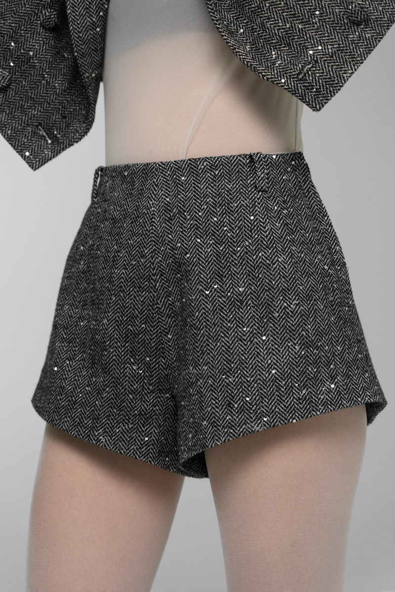 Шорты из твида, которые являются дополнением укороченного жакета. Ткань на 70% состоит из шерсти и покрыта деликатными пайетками. Шорты имеют высокую посадку и слегка асимметричный низ, за счет чего ноги выглядят длиннее. Изделие на подкладке.