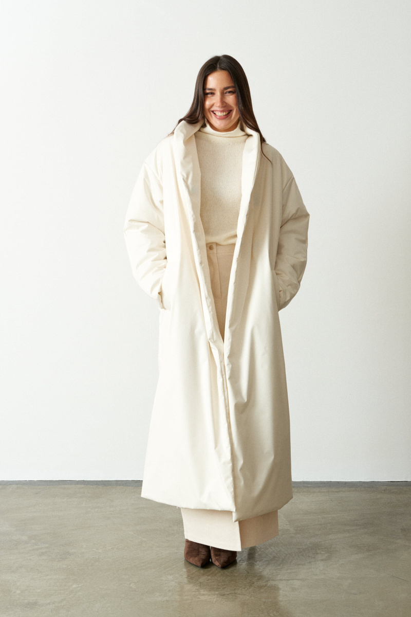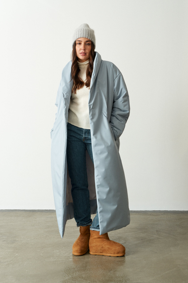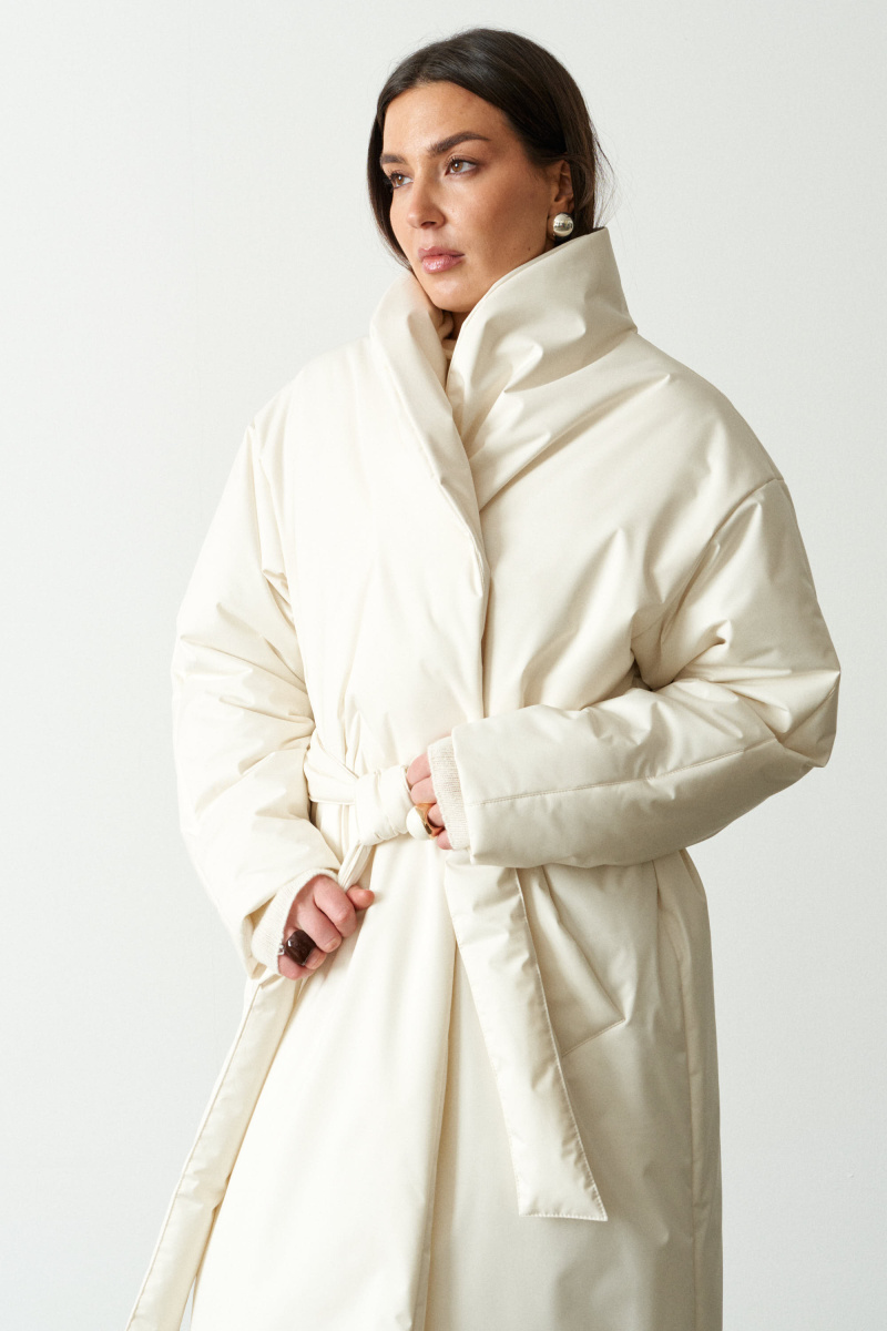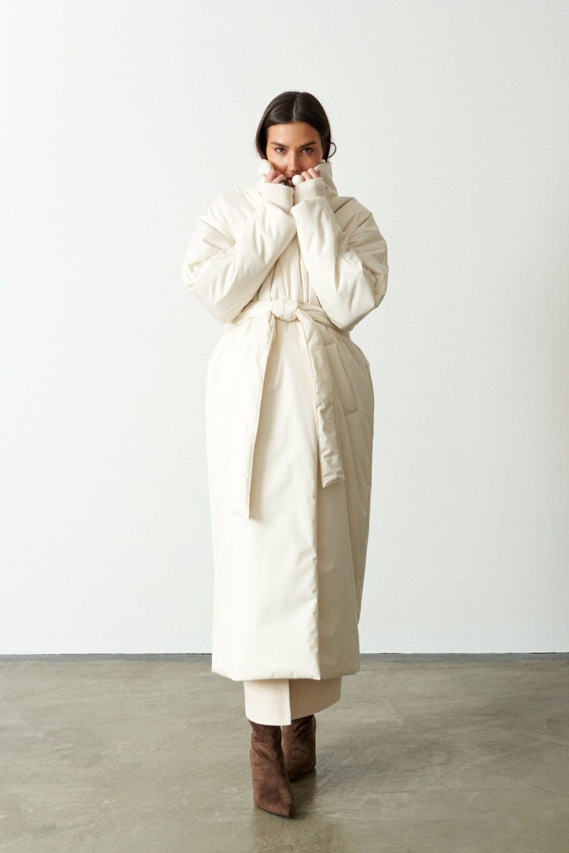 Длинное пальто-халат прямого кроя с поясом, красиво подчеркивающим талию. Выполнено из водоотталкивающей непродуваемой, но обладающей высоким воздухообменом мембраны и бельгийского наполнителя isosoft. Подходит до - 10°С. Воротник-стойка защищает от ветра и холода.