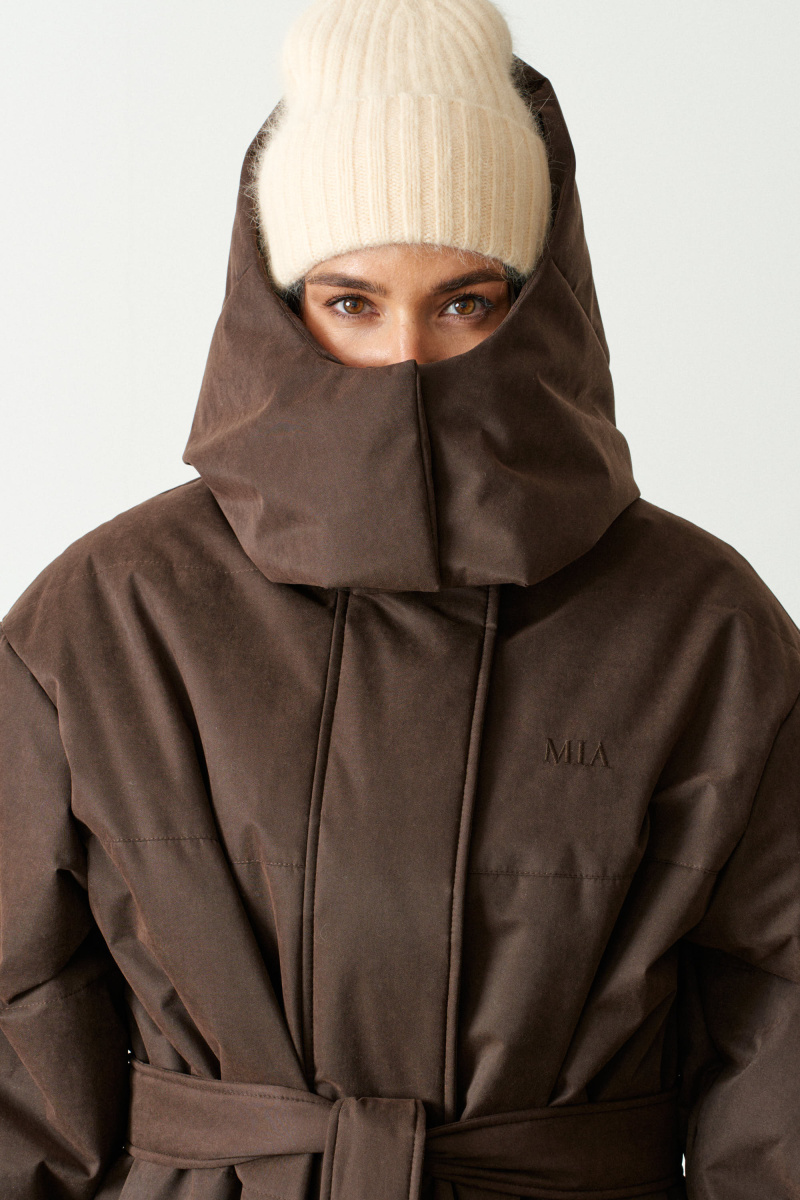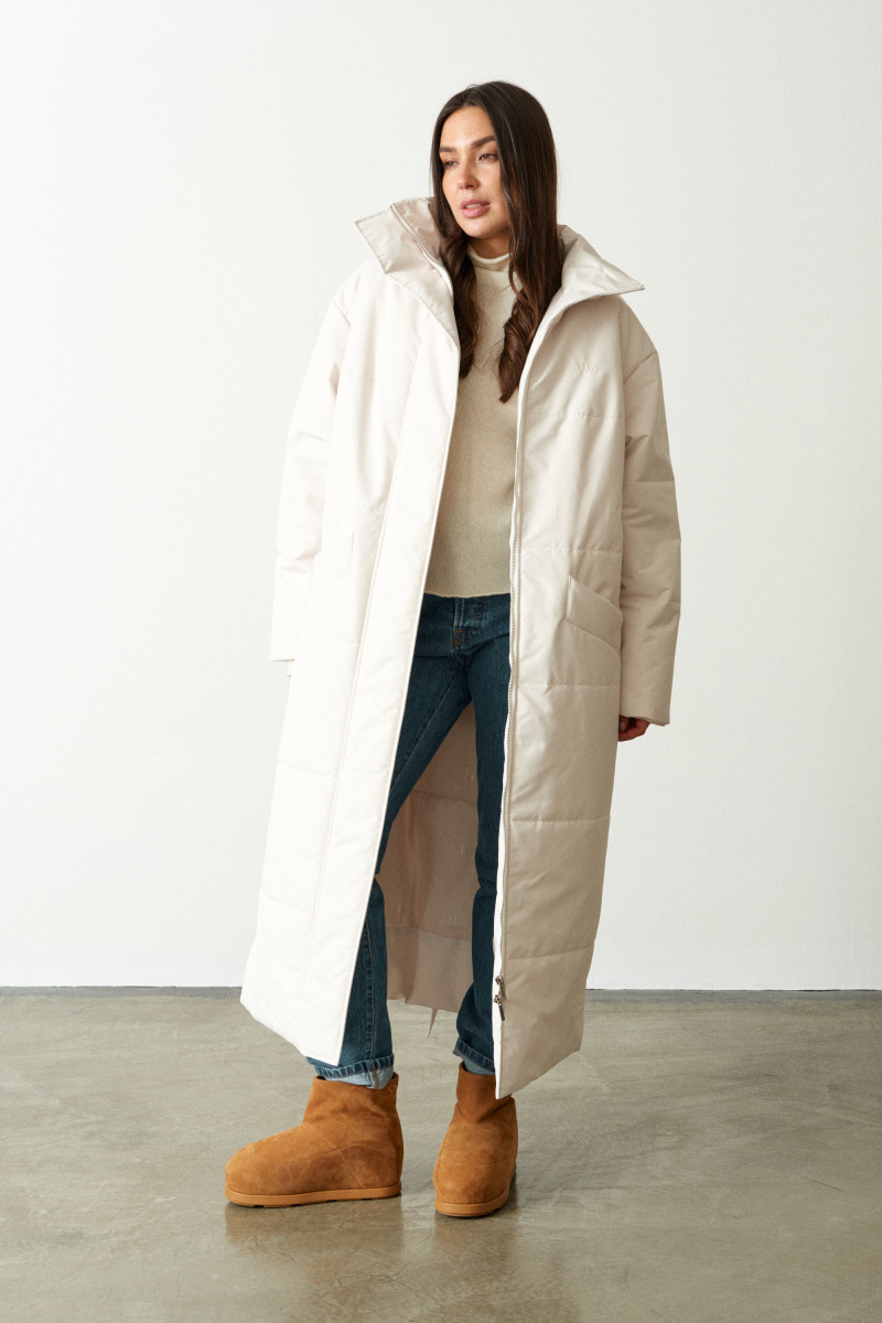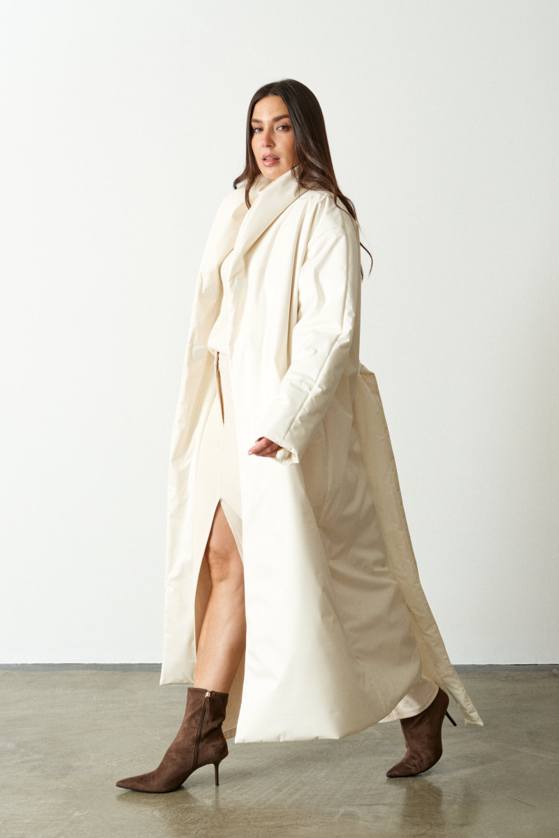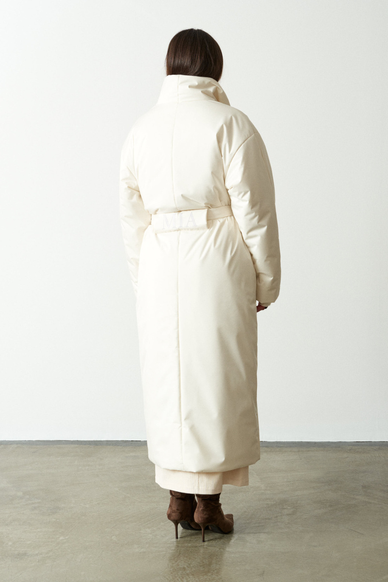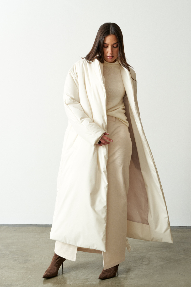 Длинное пальто-халат прямого кроя с поясом, красиво подчеркивающим талию. Выполнено из водоотталкивающей непродуваемой, но обладающей высоким воздухообменом мембраны и бельгийского наполнителя isosoft. Подходит до - 10°С. Воротник-стойка защищает от ветра и холода.